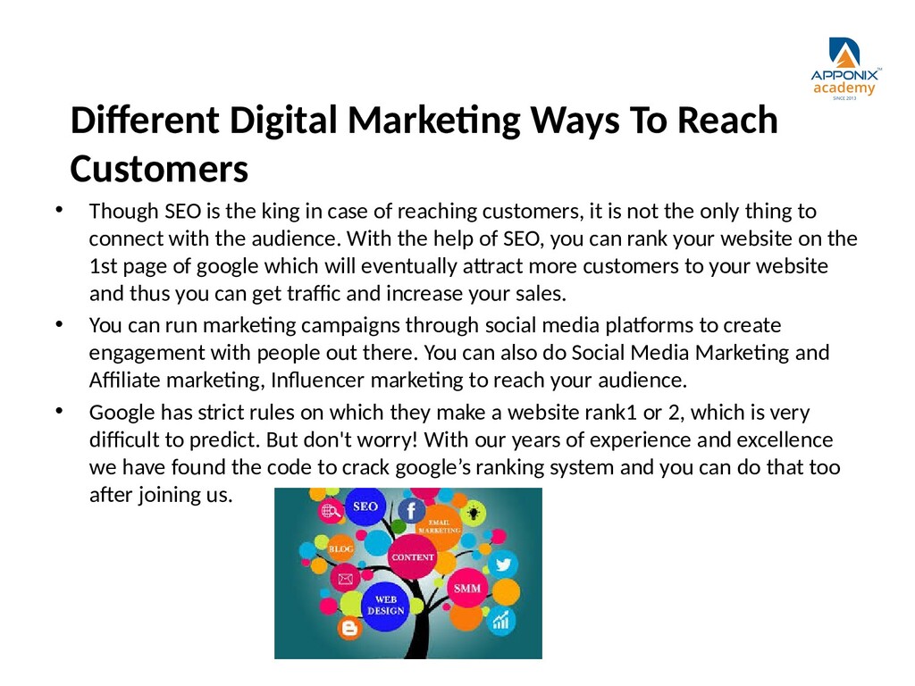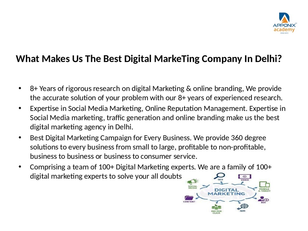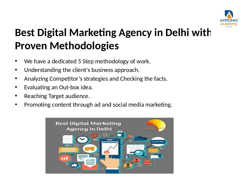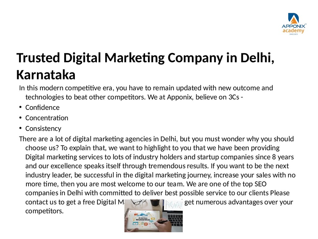 competitive era, you have to remain updated with new outcome and technologies to beat other competitors. We at Apponix, believe on 3Cs - • Confidence • Concentration • Consistency There are a lot of digital marketing agencies in Delhi, but you must wonder why you should choose us? To explain that, we want to highlight to you that we have been providing Digital marketing services to lots of industry holders and startup companies since 8 years and our excellence speaks itself through tremendous results. If you want to be the next industry leader, be successful in the digital marketing journey, increase your sales with no more time, then you are most welcome to our team. We are one of the top SEO companies in Delhi with committed to deliver best possible service to our clients Please contact us to get a free Digital Marketing advise and get numerous advantages over your competitors.
