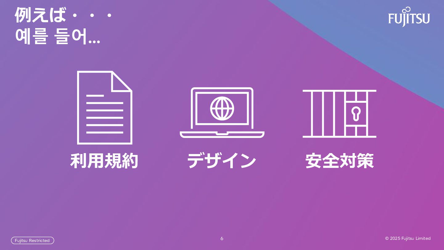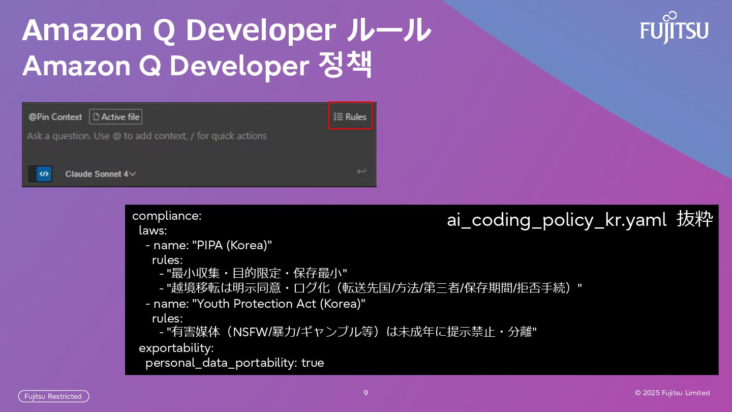 Fujitsu Limited Fujitsu Restricted Amazon Q Developer ルール Amazon Q Developer 정책 compliance: laws: - name: "PIPA (Korea)" rules: - "最小収集・目的限定・保存最小" - "越境移転は明示同意・ログ化(転送先国/方法/第三者/保存期間/拒否手続)" - name: "Youth Protection Act (Korea)" rules: - "有害媒体(NSFW/暴力/ギャンブル等)は未成年に提示禁止・分離" exportability: personal_data_portability: true ai_coding_policy_kr.yaml 抜粋