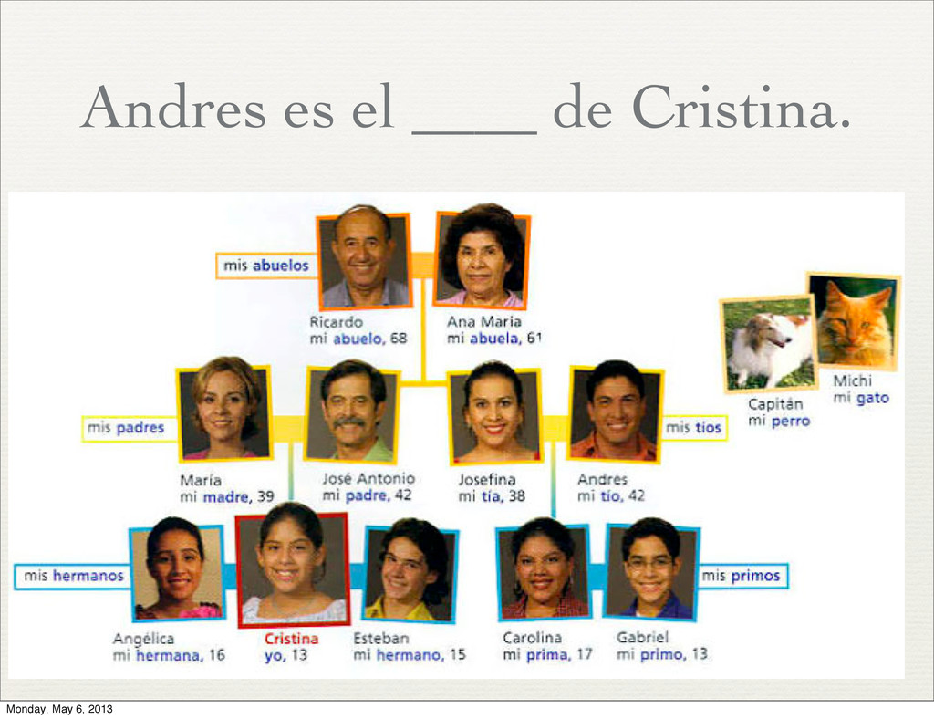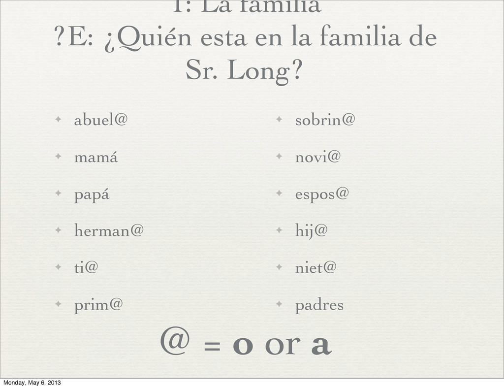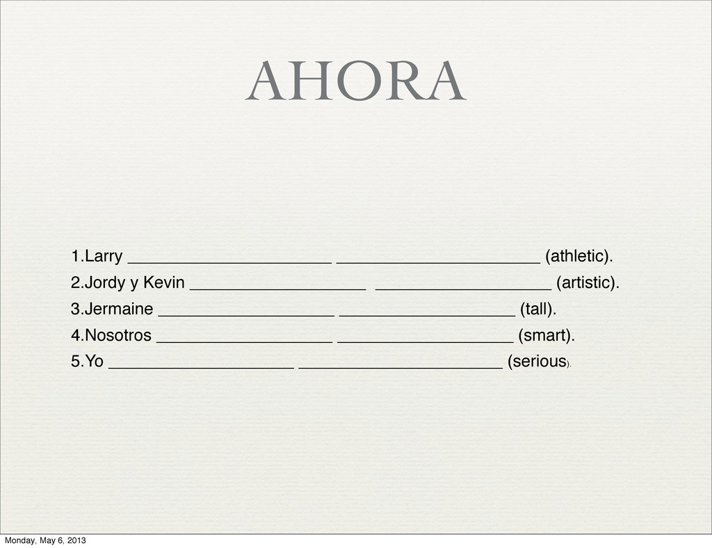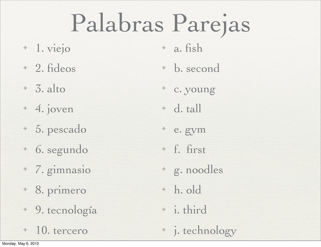 alto ✦ 4. joven ✦ 5. pescado ✦ 6. segundo ✦ 7. gimnasio ✦ 8. primero ✦ 9. tecnología ✦ 10. tercero ✦ a. fish ✦ b. second ✦ c. young ✦ d. tall ✦ e. gym ✦ f. first ✦ g. noodles ✦ h. old ✦ i. third ✦ j. technology Monday, May 6, 2013