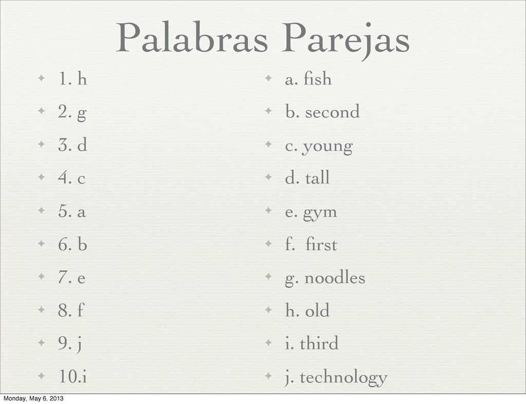 d ✦ 4. c ✦ 5. a ✦ 6. b ✦ 7. e ✦ 8. f ✦ 9. j ✦ 10.i ✦ a. fish ✦ b. second ✦ c. young ✦ d. tall ✦ e. gym ✦ f. first ✦ g. noodles ✦ h. old ✦ i. third ✦ j. technology Monday, May 6, 2013