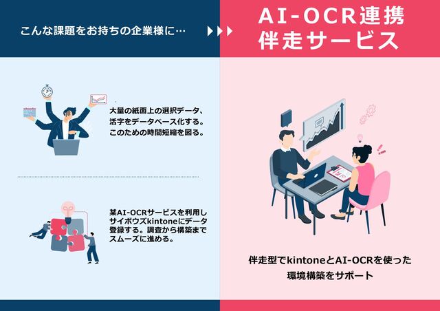 伴走型でkintoneとAI-OCRを使った環境構築のご支援をいたします。 新しくAI-OCRを導入しサイボウズkintoneへのデータ登録を推進するためのご支援を行います。