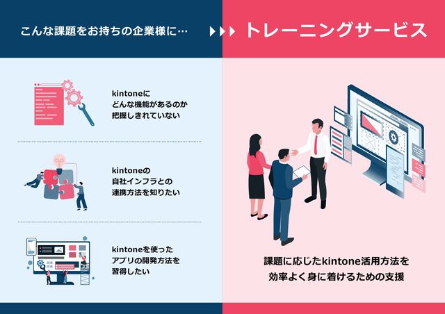 トレーニングサービス こんな課題をお持ちの企業様に… 課題に応じたkintone活用方法を 効率よく身に着けるための支援 kintoneを使った アプリの開発方法を 習得したい kintoneに どんな機能があるのか 把握しきれていない