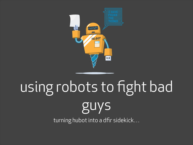 /host-fw-port - manipulate the firewall on host - /nagios - interact with nagios - /pstree - show process tree on host - /puppet - manipulate a puppet agent - /whois - show info about an addr - /logs - get application logs from a given service - /twitter - posting to & monitoring twitter - secret stuff i can’t share but i promise is awesome…