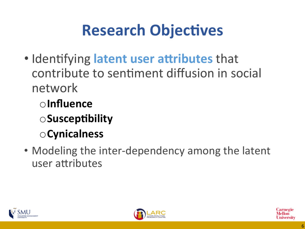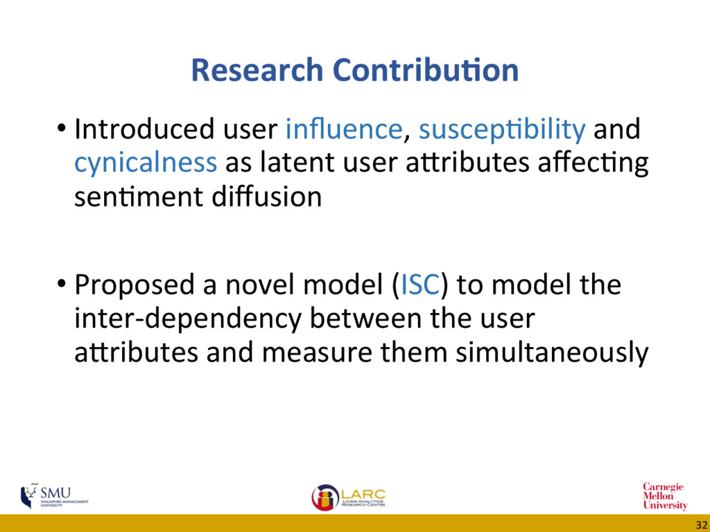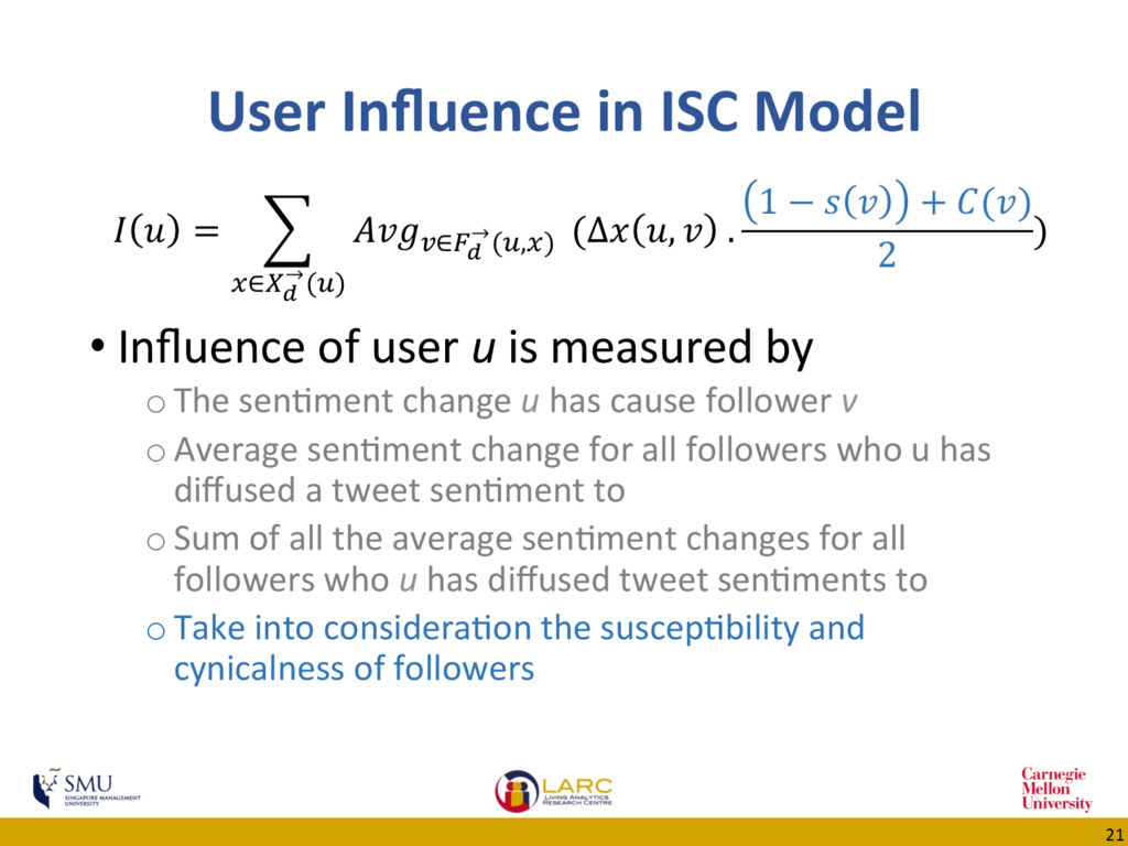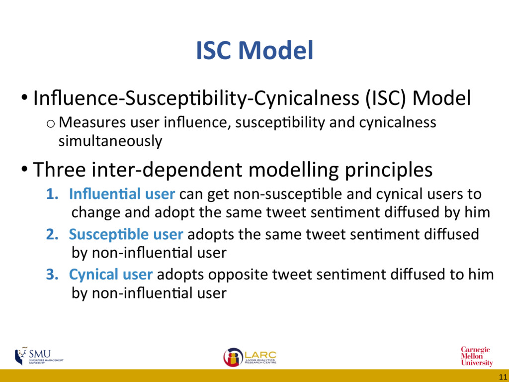 Diffusion in social networks is an important research topic lately due to massive amount of information shared on social media and Web. As information diffuses, users express sentiments which can affect the sentiments of others. In this paper, we analyze how users reinforce or modify sentiment of one another based on a set of inter-dependent latent user factors as they are engaged in some diffusion of event information. We introduce these sentiment-based latent factors, namely influence, sus- ceptibility and cynicalness. We also propose the ISC model to relate the three factors together and develop an iterative computation approach to derive them simultaneously. We evaluate the ISC model by conducting experiments on two separate sets of Twitter data collected from two real world events. The experiments show the top influential users tend to stay consistently influential while susceptibility and cynicalness of users could change significantly across events.