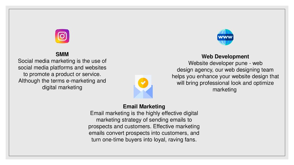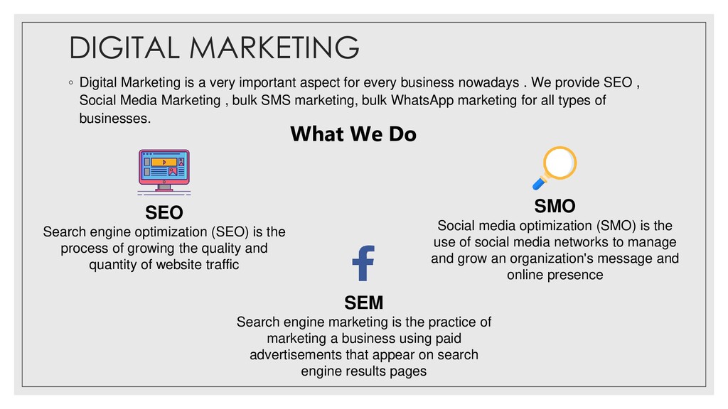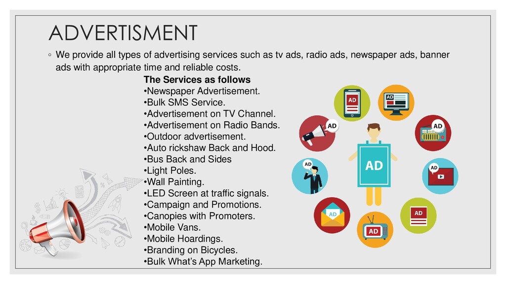 Every business needs advertisement and marketing for expansion and growth. Day by day competition is growing like anything for every business. Therefore for prominent growth in business, we need to take some efforts on advertising and marketing the business. We actually do that for your business. It's not only about advertising and marketing but it's your base of business growth. For a particular business, we need to market on proper channels at the proper time. We provide you all types of advertising and marketing solutions as per your requirement