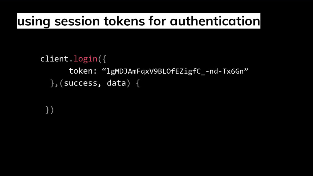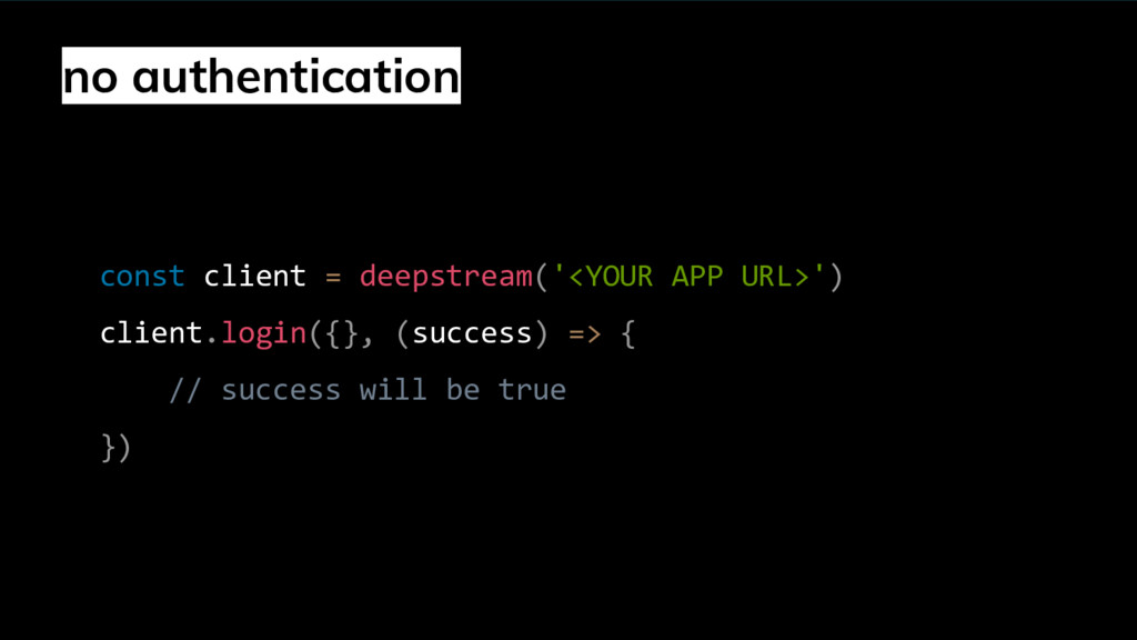 prompt("Enter email", ""); var myPass = prompt("Enter your password", ""); client.login({ email: myEmail, password: myPass }, function(success, data) { if (success) { //replace the token in localStorage with new one localStorage.setItem('deepstream-token', data.token) onSuccessfulLogin(data) } else { // user login failed } }) } 3