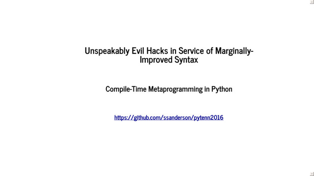 the pyxl encoding from pytenn2016.pyxl import hello_html hello_html() <pyxl.html.x_html at 0x7f65c435b470> str(hello_html()) '<html><body>Hello World!</body></html>'