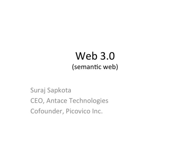 become capable of analyzing all the data on the Web – the content, links, and transac-ons between people and computers. In such a ‘Seman7c Web’, the day-‐to-‐day mechanisms of trade, bureaucracy and our daily lives will be handled by machines talking to machines. The ‘intelligent agents’ people have touted for ages will finally materialize.” -‐ Tim Berners-‐Lee, 1999 Inventor of the Web