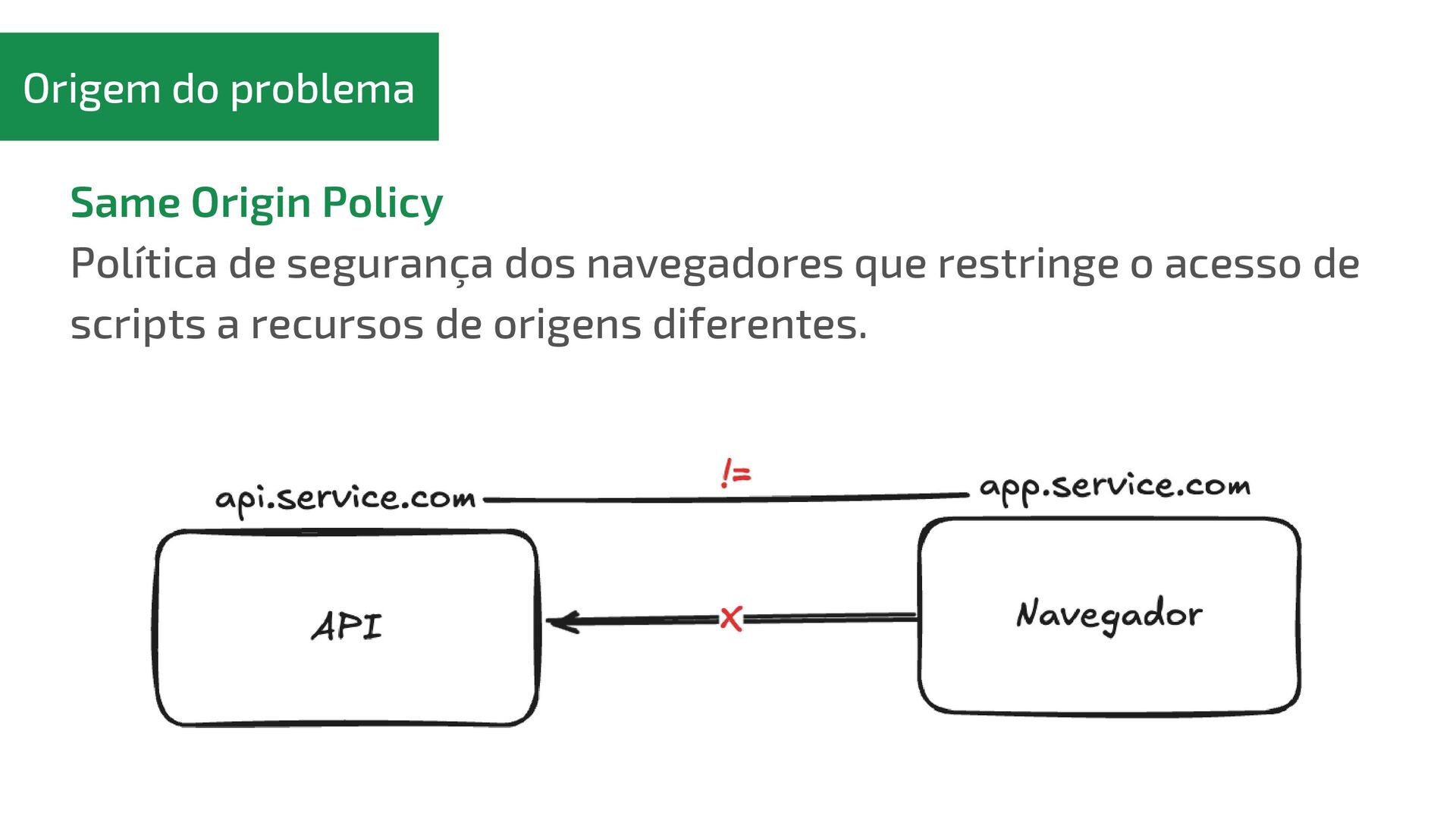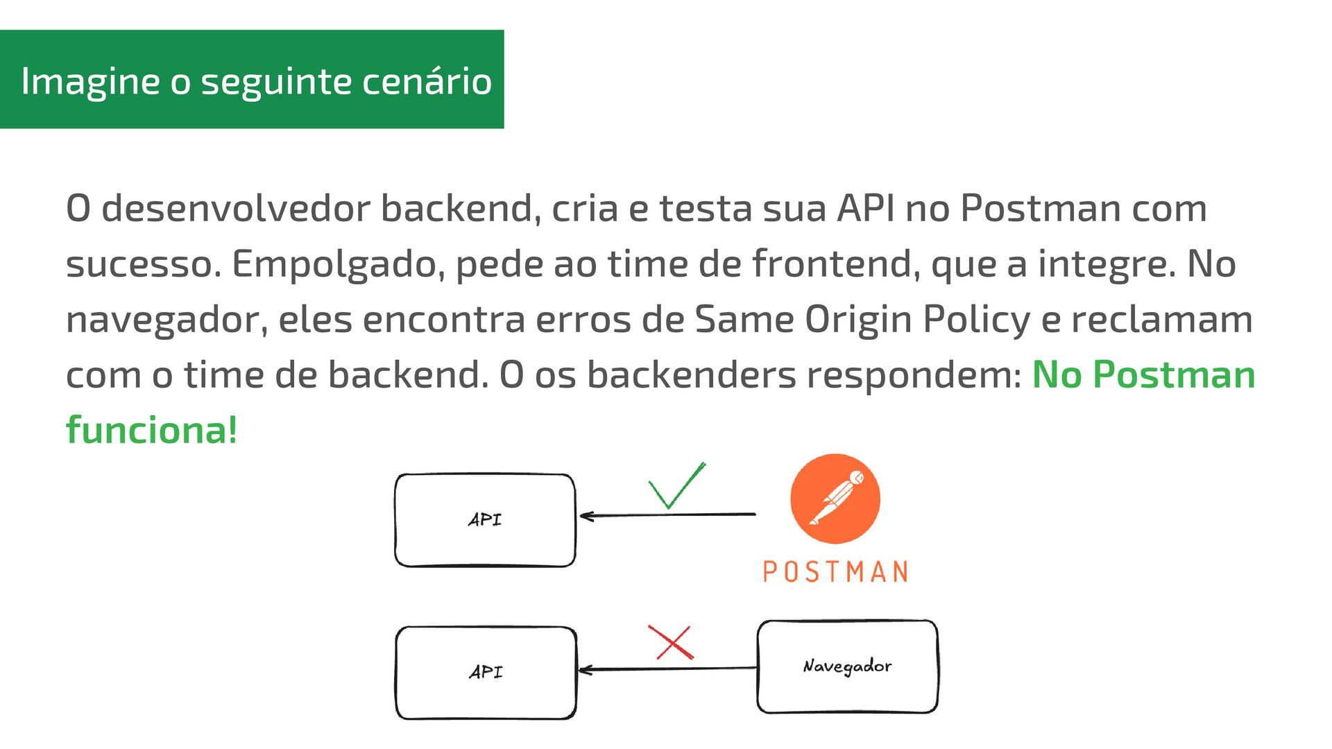 sua API no Postman com sucesso. Empolgado, pede ao time de frontend, que a integre. No navegador, eles encontra erros de Same Origin Policy e reclamam com o time de backend. O os backenders respondem: No Postman funciona!