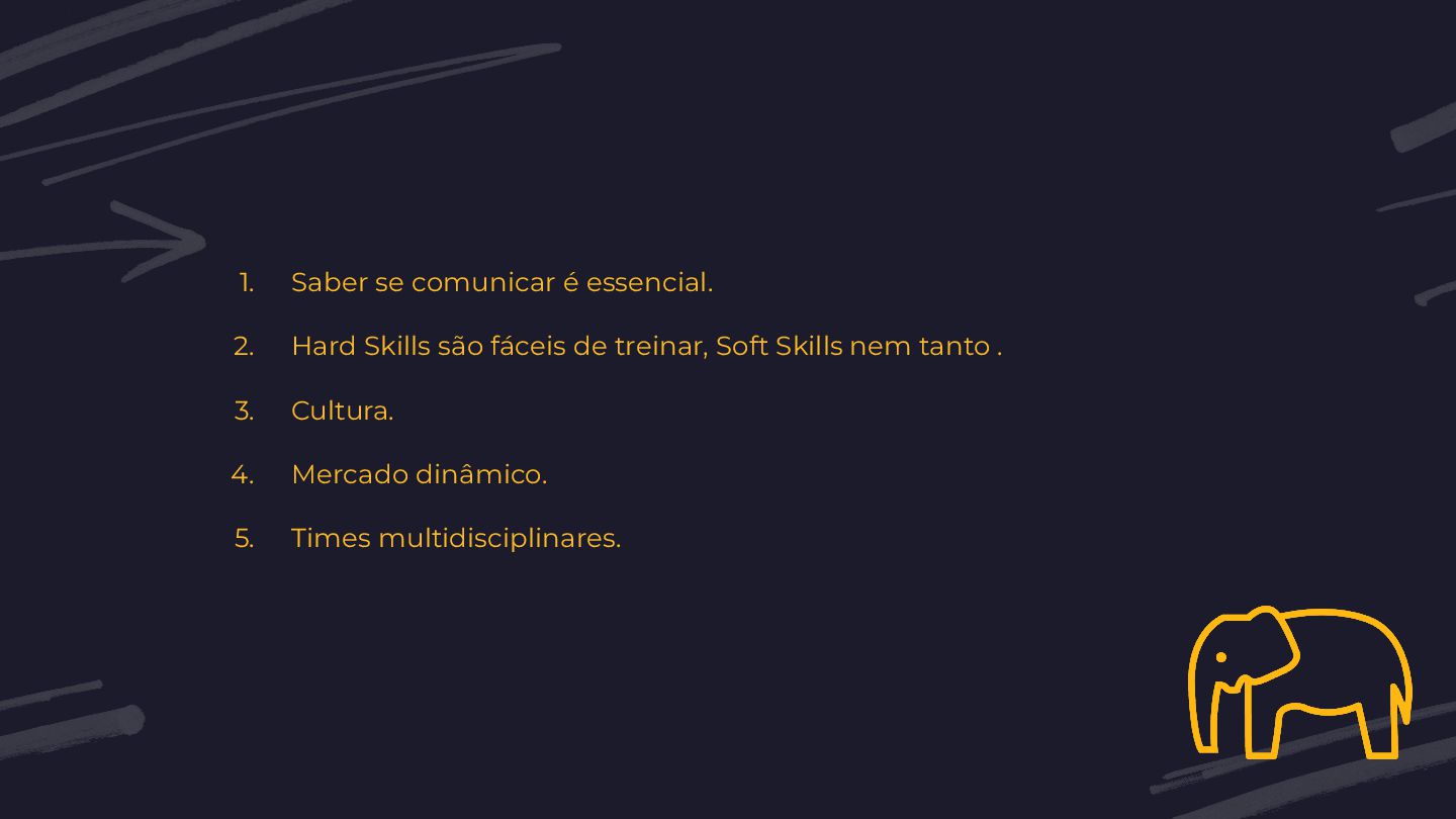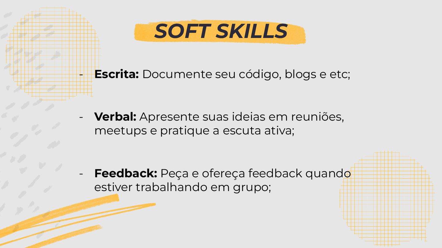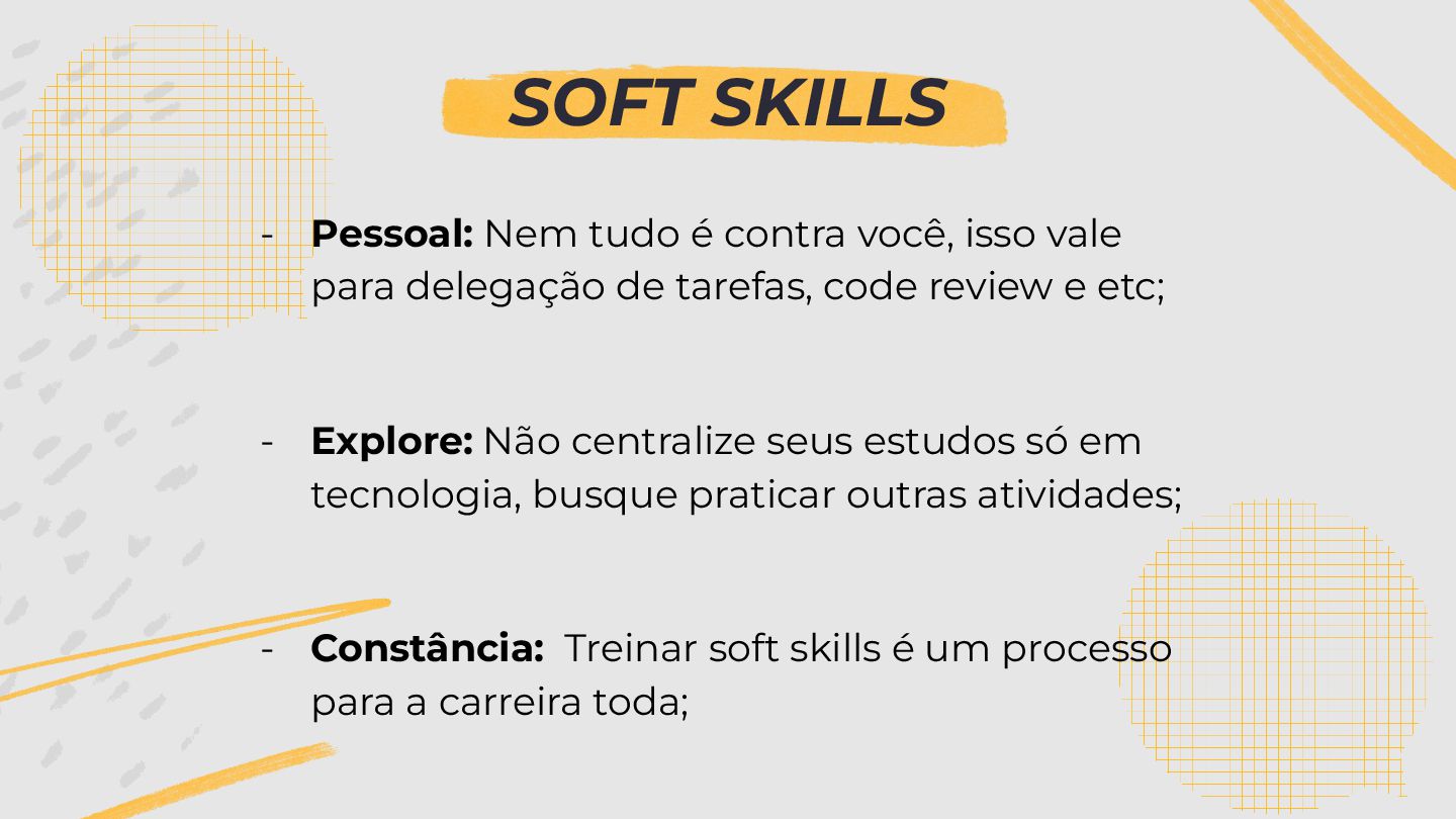 vale para delegação de tarefas, code review e etc; - Explore: Não centralize seus estudos só em tecnologia, busque praticar outras atividades; - Constância: Treinar soft skills é um processo para a carreira toda;