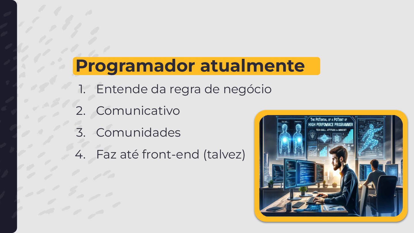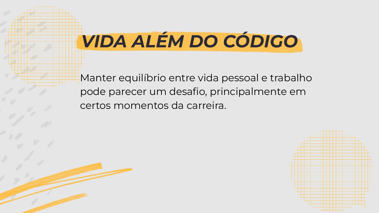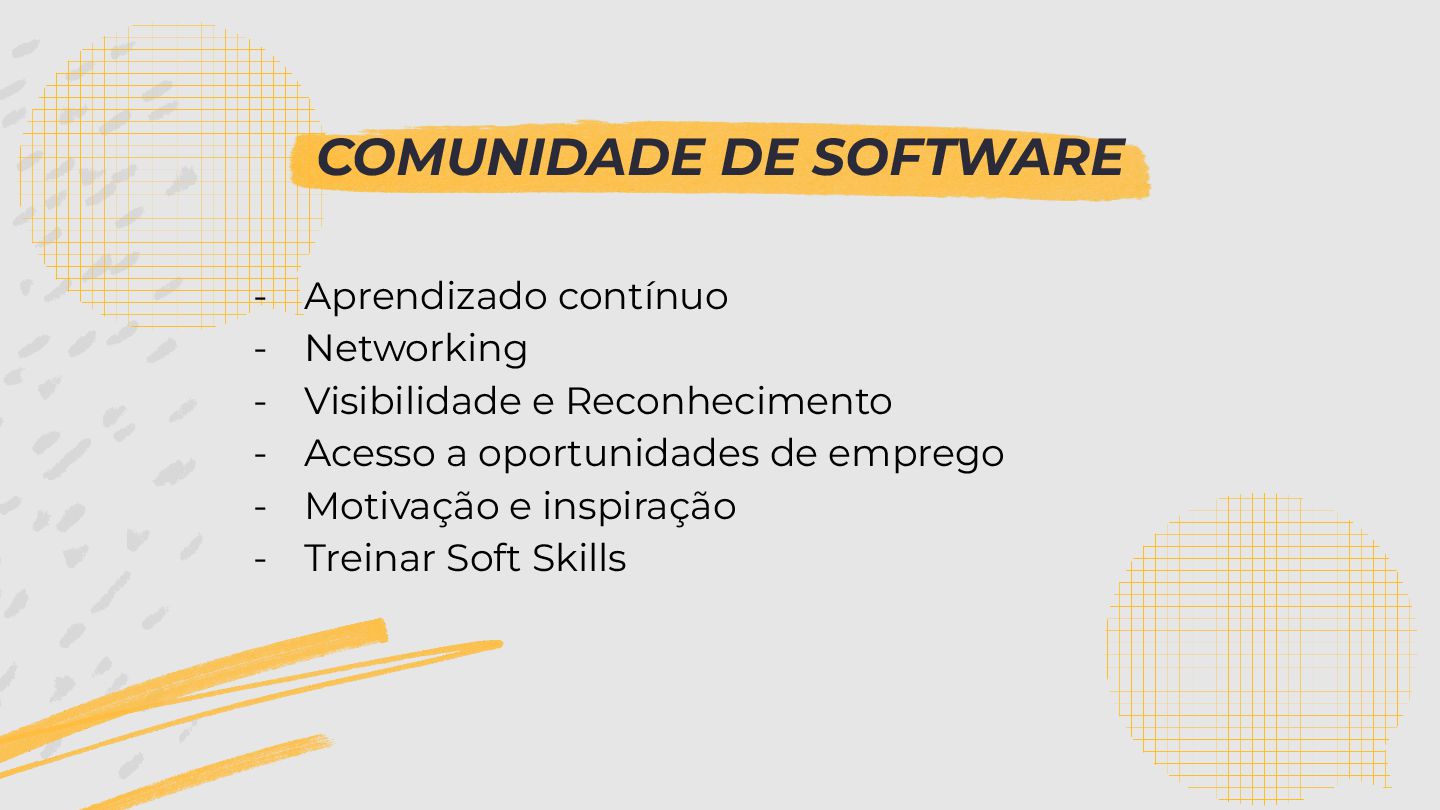 vale para delegação de tarefas, code review e etc; - Explore: Não centralize seus estudos só em tecnologia, busque praticar outras atividades; - Constância: Treinar soft skills é um processo para a carreira toda;