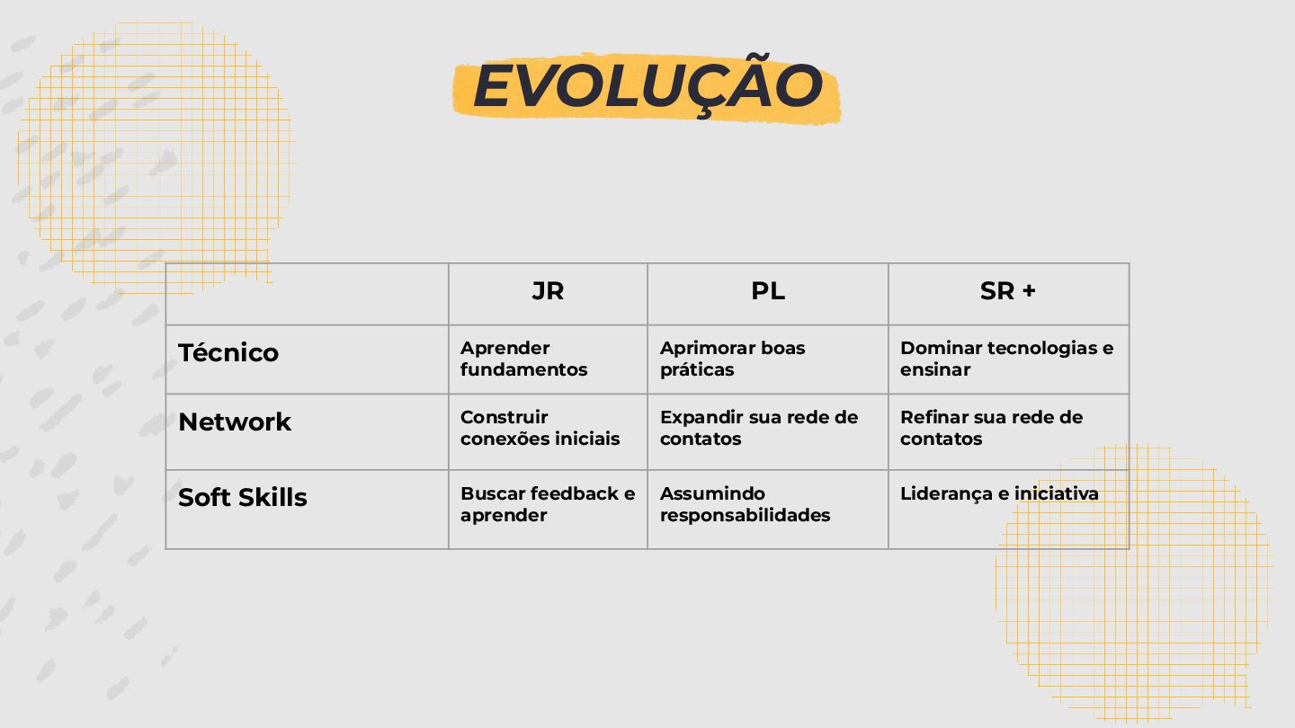 práticas Dominar tecnologias e ensinar Network Construir conexões iniciais Expandir sua rede de contatos Refinar sua rede de contatos Soft Skills Buscar feedback e aprender Assumindo responsabilidades Liderança e iniciativa