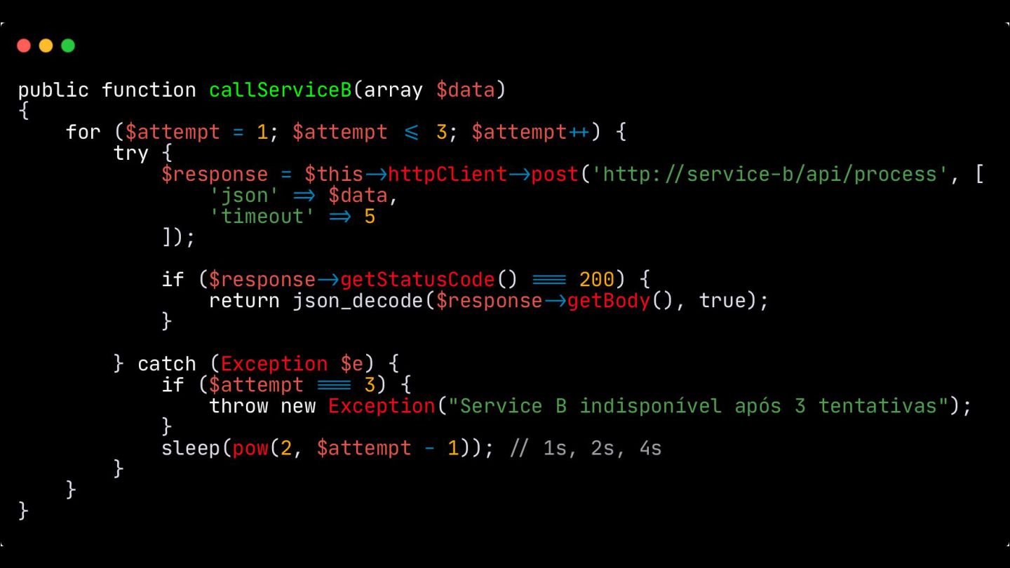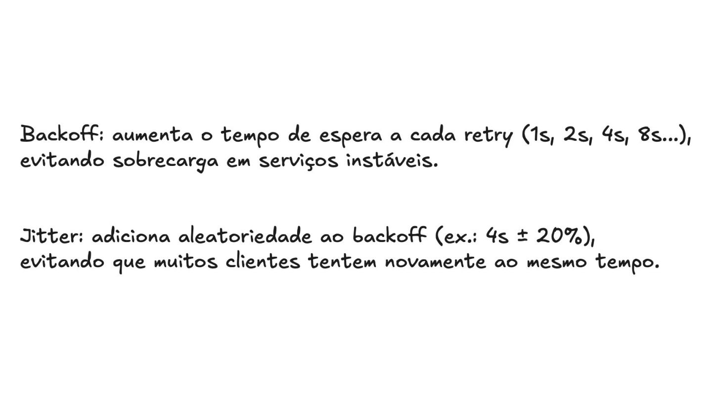 Retry: Mostrei como este padrão lida com falhas temporárias, como timeouts ou perda de pacotes. Expliquei a importância do exponential backoff e do jitter para evitar sobrecarga nos serviços que estão se recuperando.