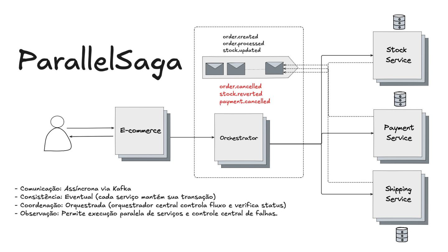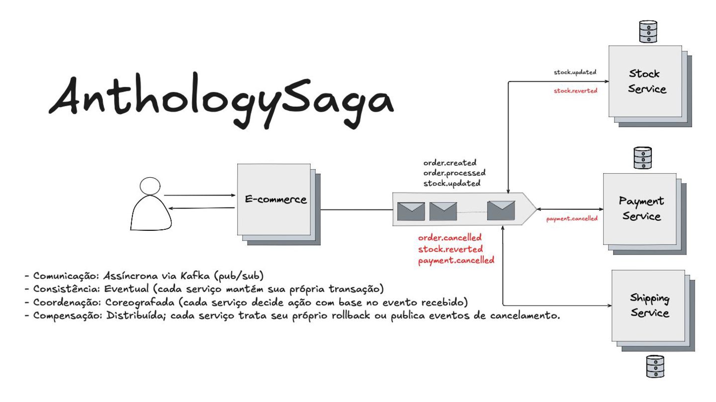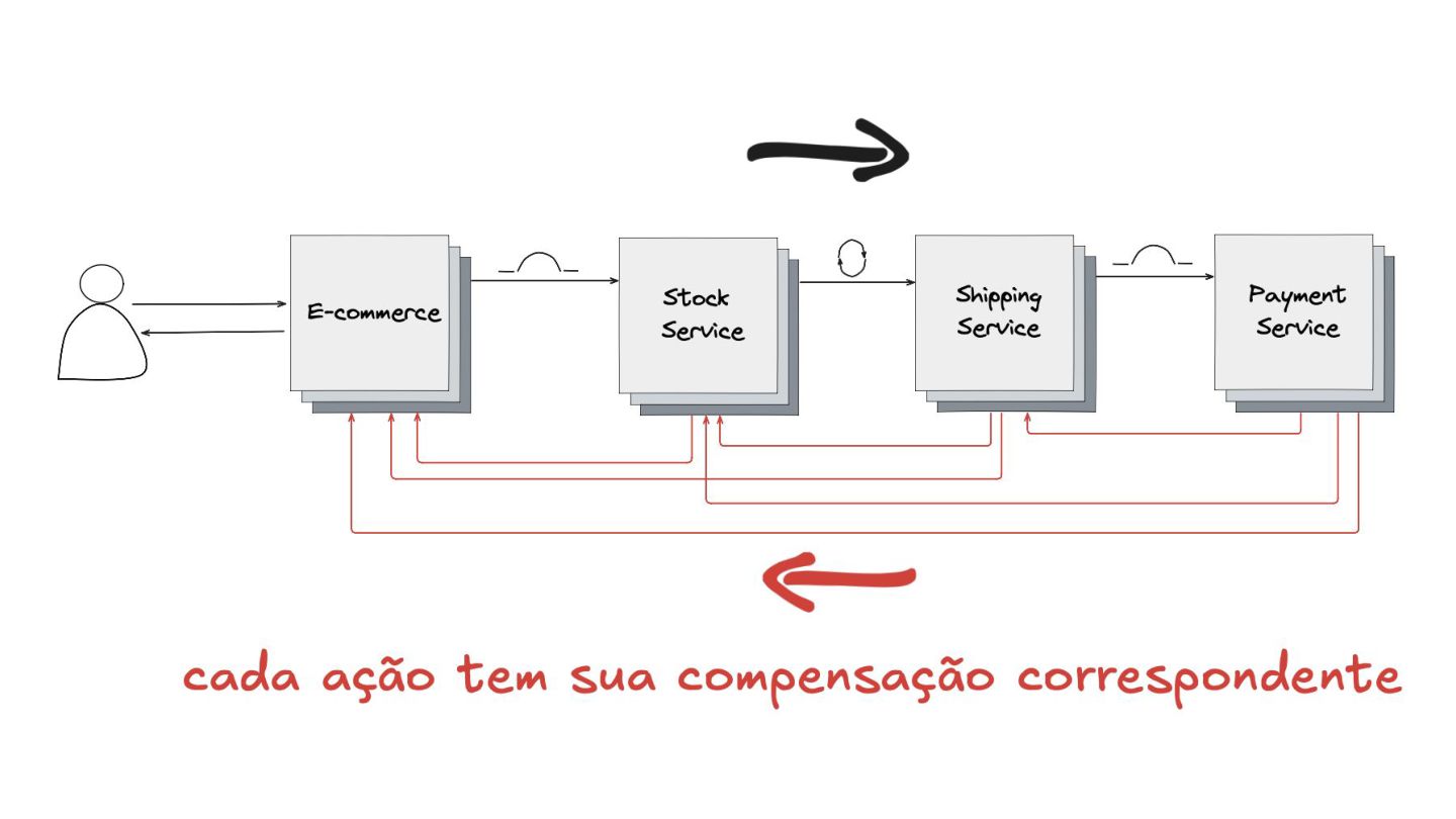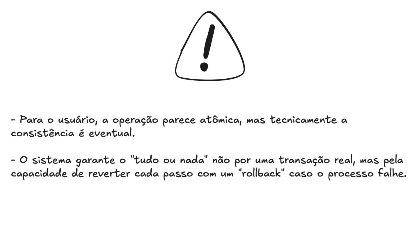 Apresentei também o padrão Saga, uma forma de garantir a consistência das transações em sistemas distribuídos. Eu mostrei como cada ação tem uma compensação correspondente para "desfazer" operações em caso de falha. Em seguida, diferenciei os modelos de comunicação assíncrona (Choreographed Saga) e síncrona (Orchestrated Saga), mostrando soluções para diferentes cenários.