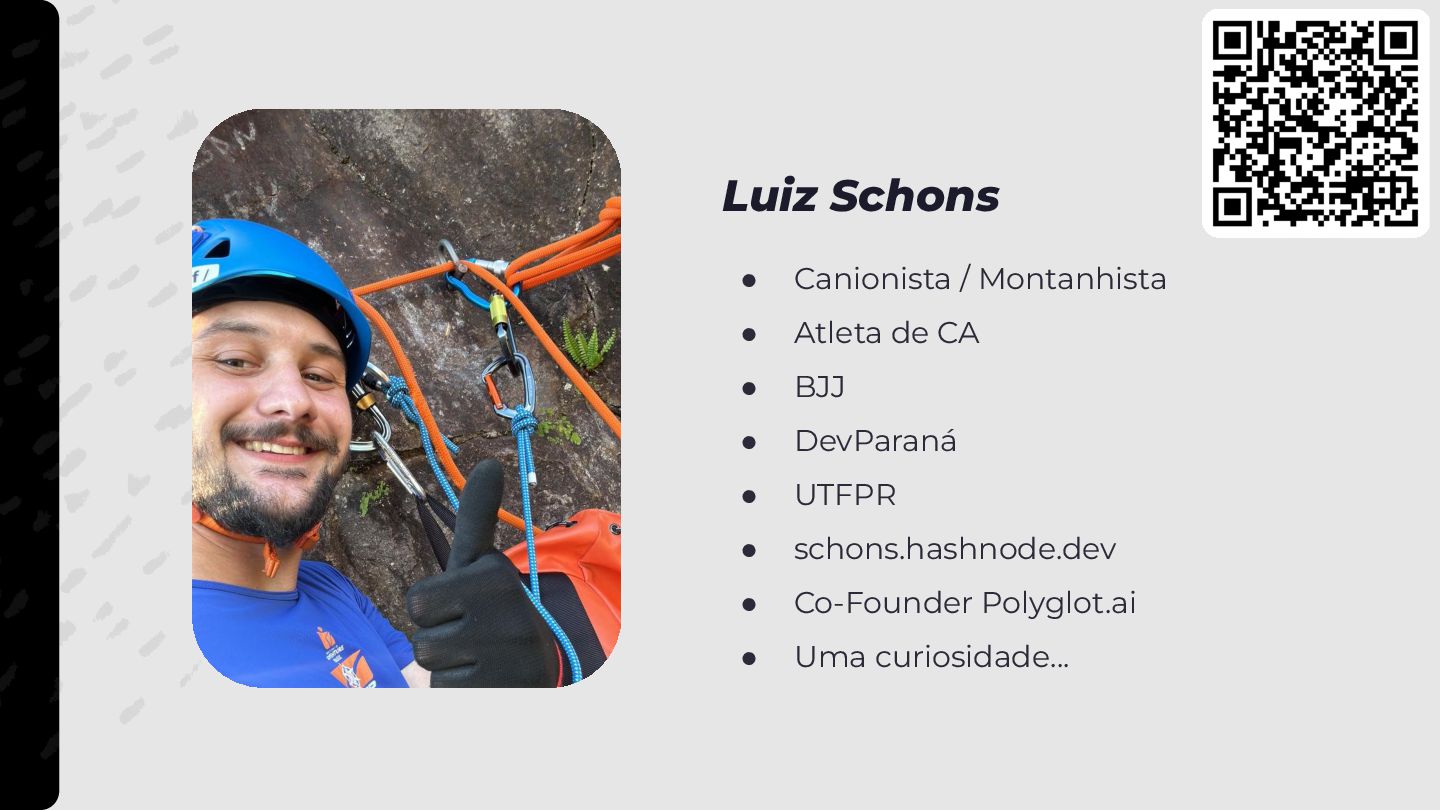 • DevParaná • UTFPR • schons.hashnode.dev • Co-Founder Polyglot.ai • Uma curiosidade… Luiz Schons