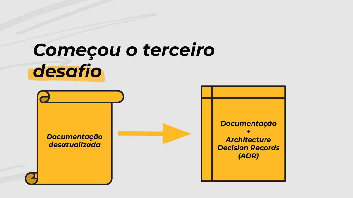 Começou o terceiro desafio Documentação desatualizada Documentação + Architecture Decision