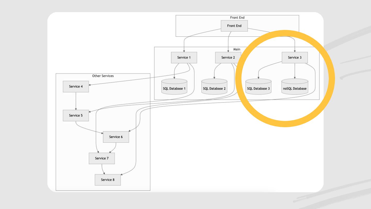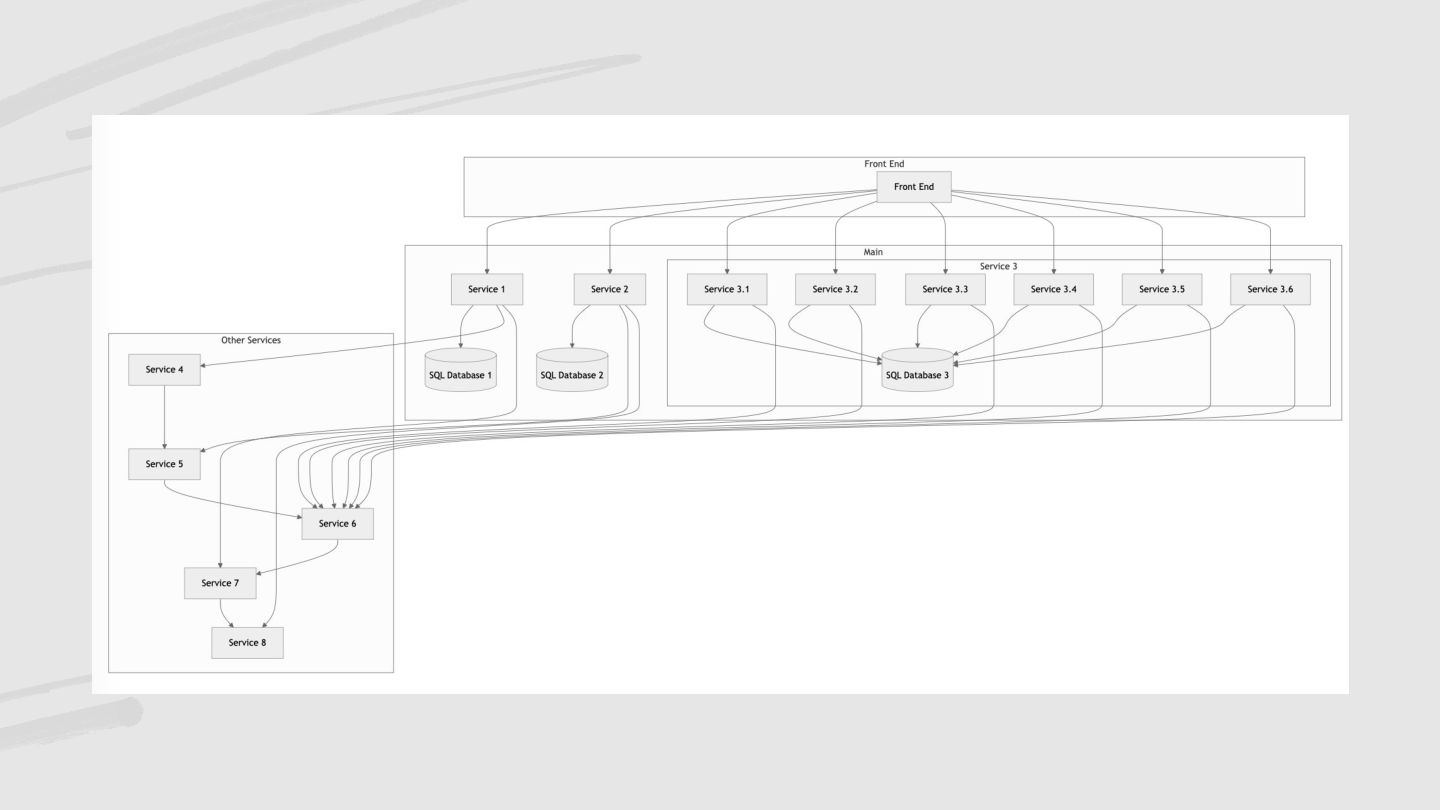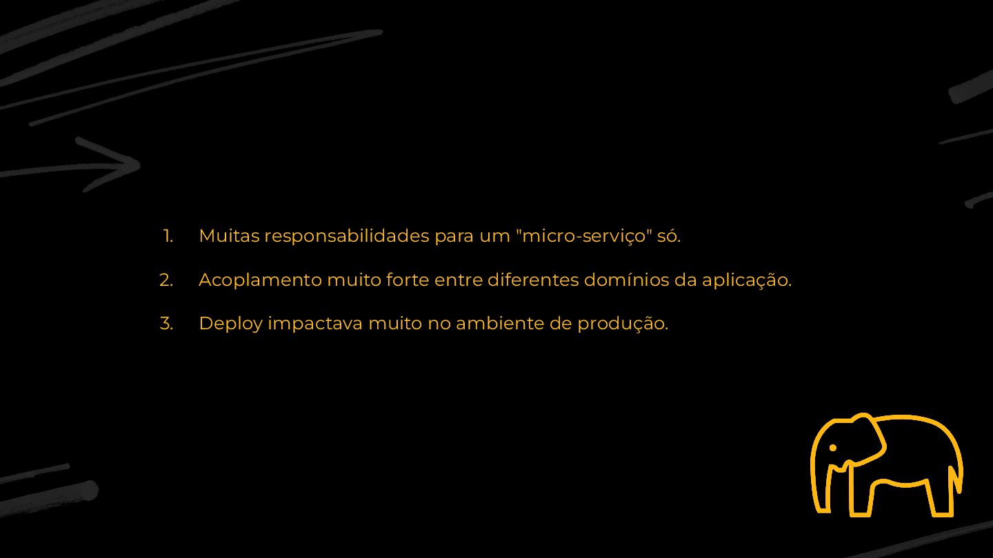 1. Muitas responsabilidades para um "micro-serviço" só. 2. Acoplamento muito