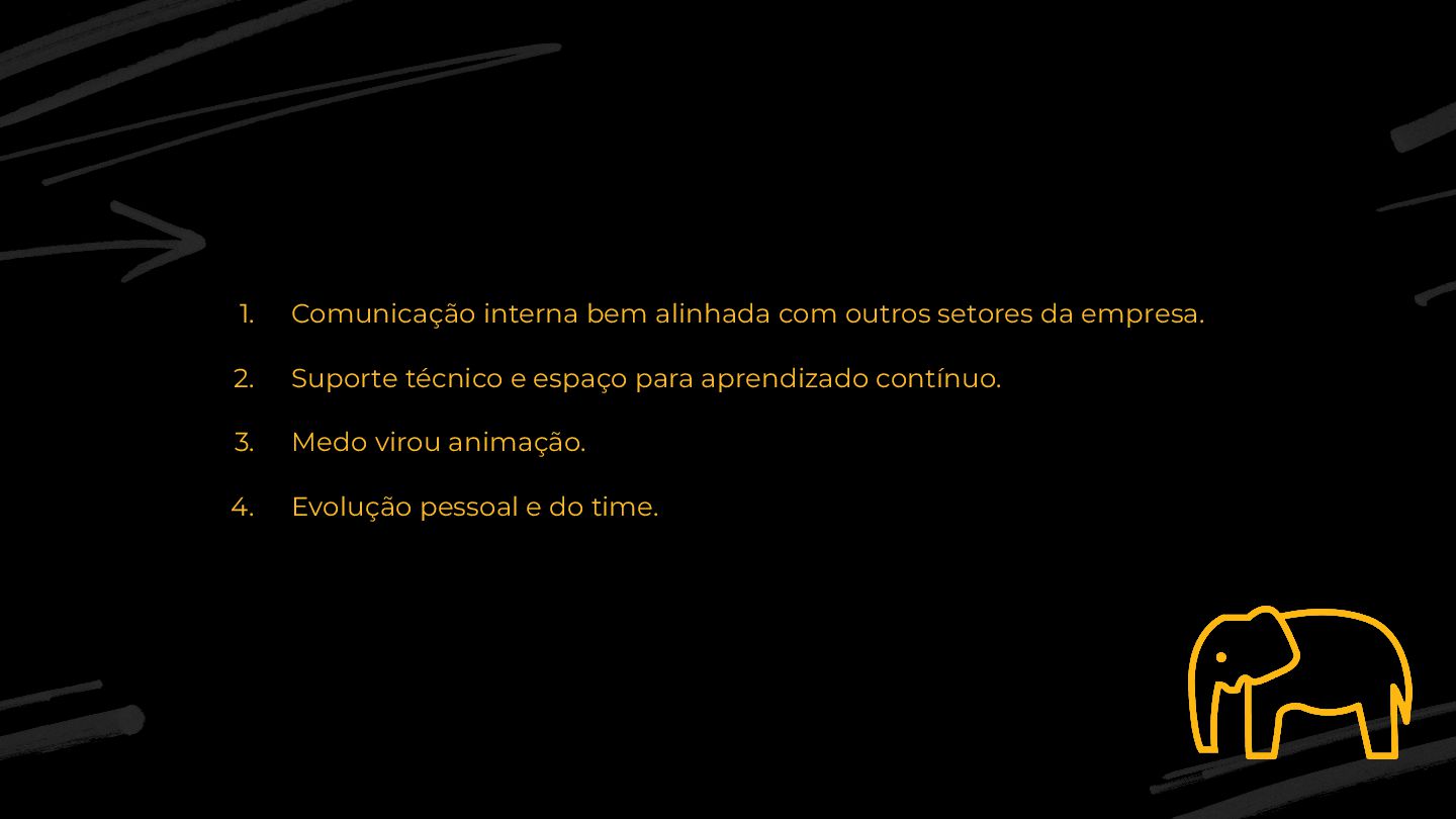 2. Suporte técnico e espaço para aprendizado contínuo. 3. Medo virou animação. 4. Evolução pessoal e do time.