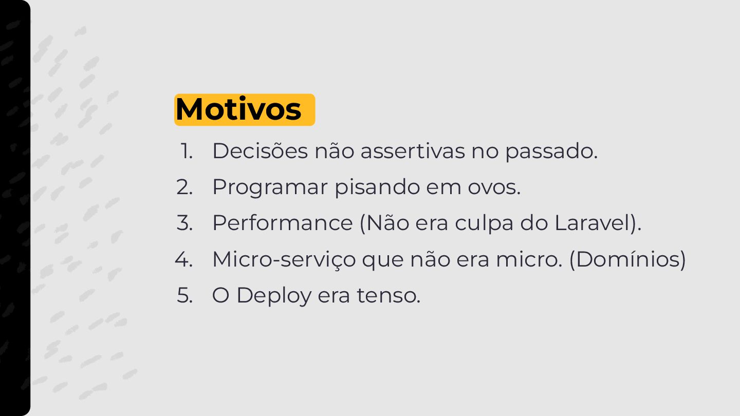 em ovos. 3. Performance (Não era culpa do Laravel). 4. Micro-serviço que não era micro. (Domínios) 5. O Deploy era tenso.