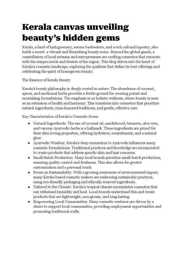 lush greenery, serene backwaters, and a rich cultural tapestry, also holds a secret: a vibrant and flourishing beauty scene. Beyond the global giants, a constellation of local artisans and entrepreneurs are crafting cosmetics that resonate with the unique needs and desires of the region. This blog delves into the heart of Kerala's cosmetic landscape, exploring the qualities that define its best offerings and celebrating the spirit of homegrown beauty. The Essence of Kerala Beauty: Kerala's beauty philosophy is deeply rooted in nature. The abundance of coconut, spices, and medicinal herbs provides a fertile ground for creating potent and nourishing formulations. The emphasis is on holistic wellness, where beauty is seen as an extension of health and harmony. This translates into cosmetics that prioritize natural ingredients, time-honored traditions, and gentle, effective care. Key Characteristics of Kerala's Cosmetic Scene: • Natural Ingredients: The use of coconut oil, sandalwood, turmeric, aloe vera, and various Ayurvedic herbs is a hallmark. These ingredients are prized for their skin-loving properties, offering hydration, nourishment, and a natural glow. • Ayurvedic Wisdom: Kerala's deep connection to Ayurveda influences many cosmetic formulations. Traditional practices and knowledge are incorporated to create products that address specific skin and hair concerns. • Small-Batch Production: Many local brands prioritize small-batch production, ensuring quality control and freshness. This also allows for greater customization and a personal touch. • Focus on Sustainability: With a growing awareness of environmental impact, many Kerala-based cosmetic makers are embracing sustainable practices, using eco-friendly packaging and ethically sourced ingredients. • Tailored to the Climate: Kerala's tropical climate necessitates cosmetics that can withstand humidity and heat. Local brands understand this and create products that are lightweight, non-greasy, and long-lasting. • Empowering Local Communities: Many cosmetic ventures are driven by a desire to support local communities, providing employment opportunities and promoting traditional crafts.