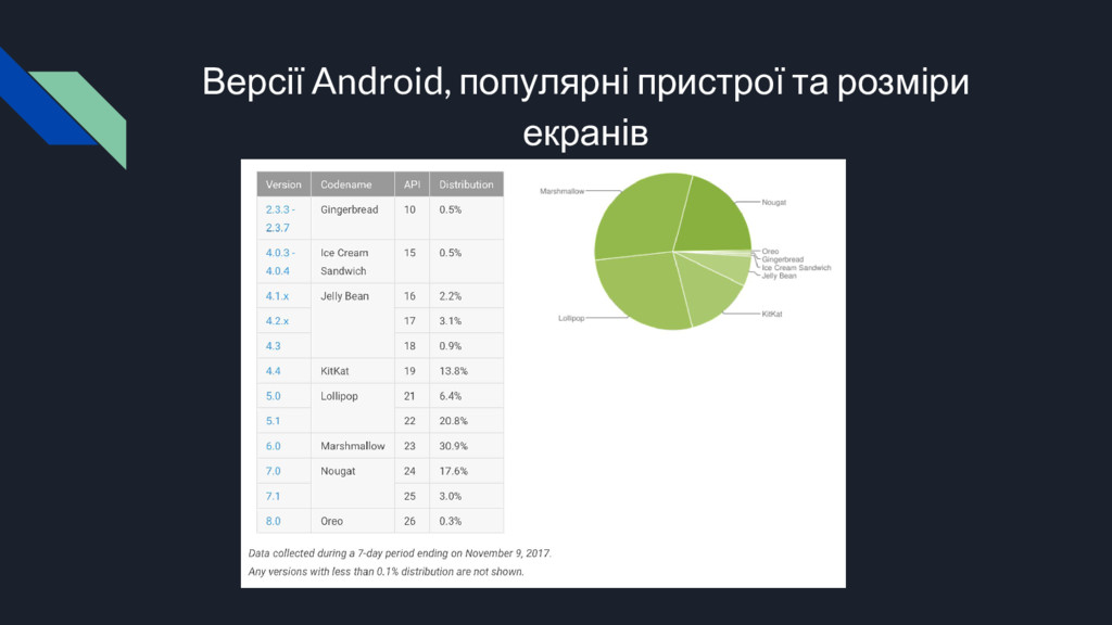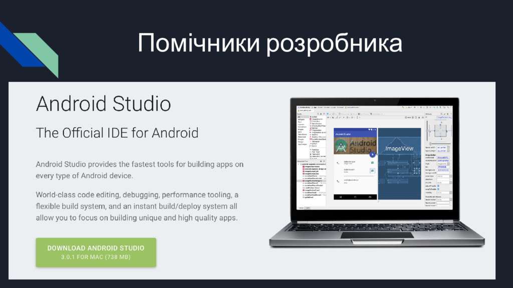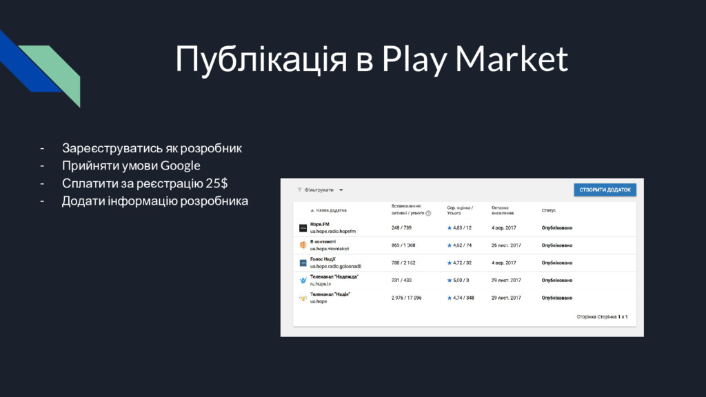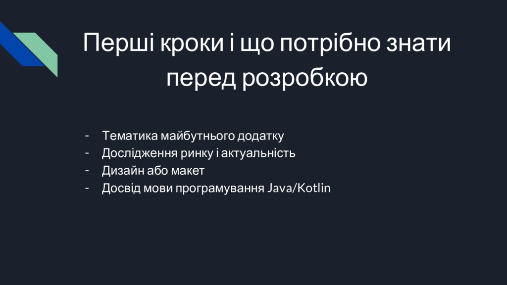 розробкою - Оцінка затрат часу і вартості - Версії Android, популярні пристрої та розміри екранів - Помічники розробника - Перша аплікація (застосунок) - Публікація в Play Market - Супровід. Виправлення помилок. Зв’язок з користувачем - Корисні посилання