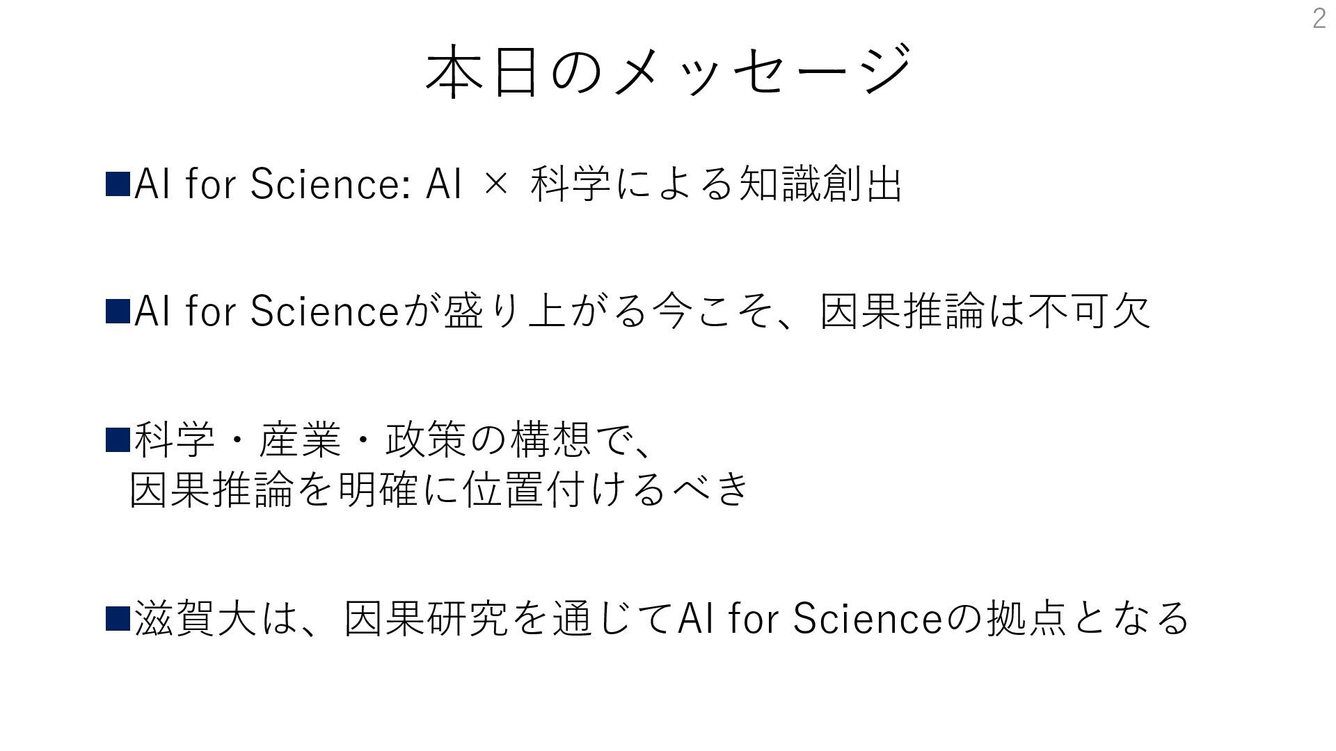 ◼科学・産業・政策の構想で、 因果推論を明確に位置付けるべき ◼滋賀大は、因果研究を通じてAI for Scienceの拠点となる 2