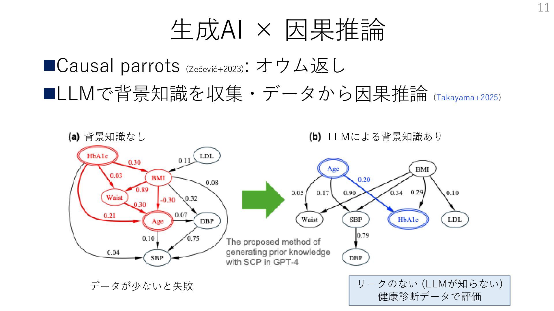 生成AI × 因果推論 ◼Causal parrots (Zečević+2023) : オウム返し ◼LLMで背景知識を収集・データから因果推論 (Takayama+2025)