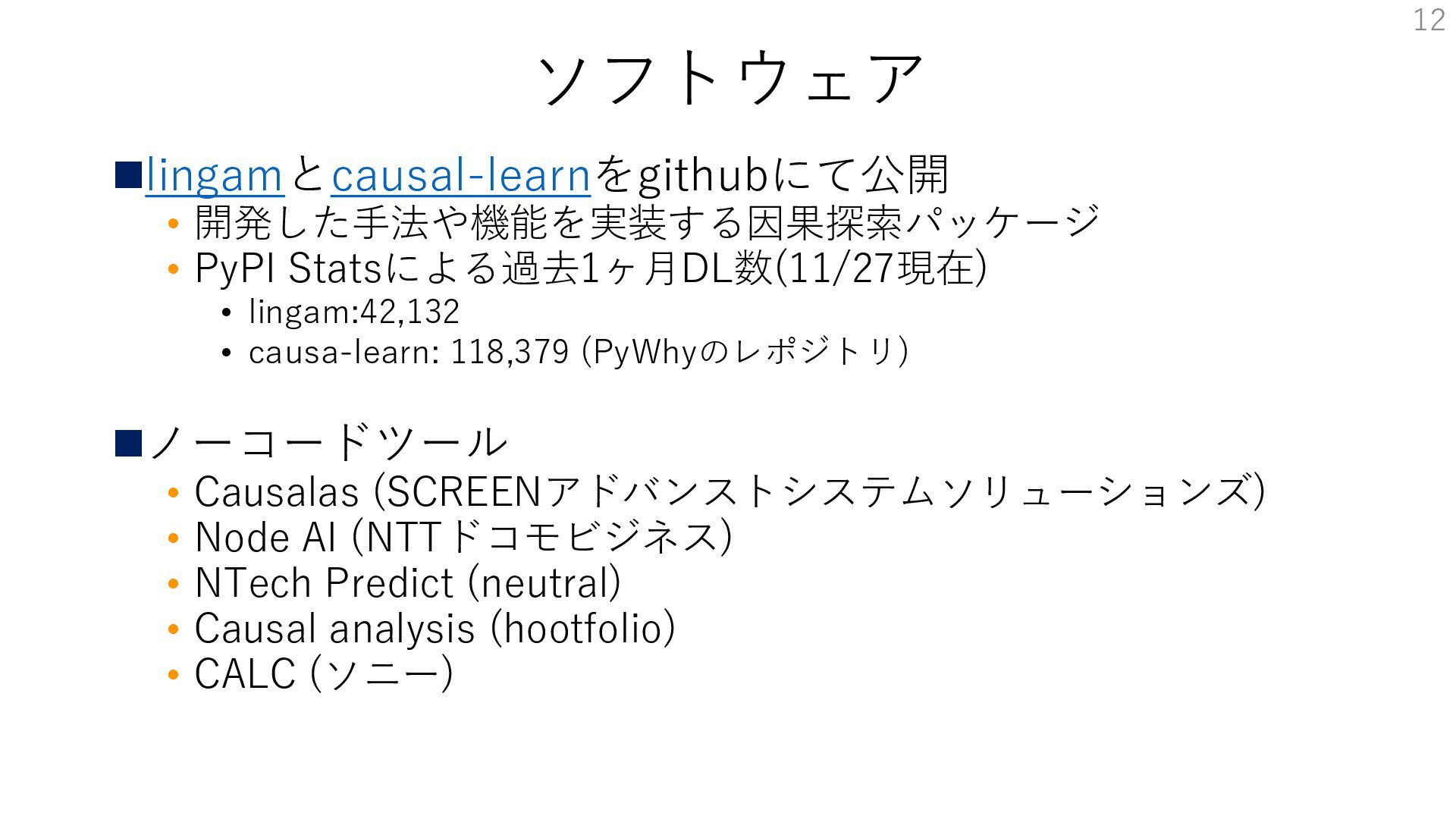 ソフトウェア ◼lingamとcausal-learnをgithubにて公開 • 開発した手法や機能を実装する因果探索パッケージ • PyPI Statsによる過去1ヶ月DL数(11/27現在) • lingam:42,132 •