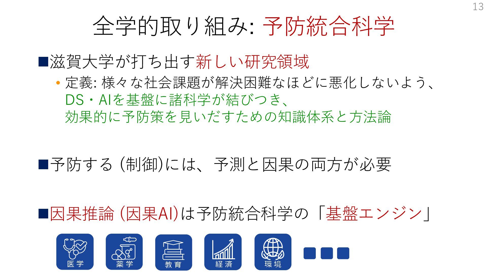 全学的取り組み: 予防統合科学 ◼滋賀大学が打ち出す新しい研究領域 • 定義: 様々な社会課題が解決困難なほどに悪化しないよう、 DS・AIを基盤に諸科学が結びつき、 効果的に予防策を見いだすための知識体系と方法論 ◼予防する (制御)には、予測と因果の両方が必要