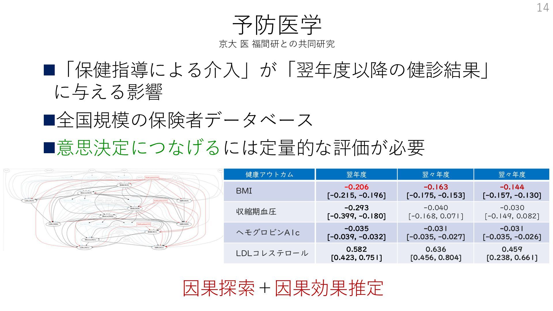翌々年度 翌々年度 BMI -0.206 [-0.215, -0.196] -0.163 [-0.175, -0.153] -0.144 [-0.157, -0.130] 収縮期血圧 -0.293 [-0.399, -0.180] -0.040 [-0.168, 0.071] -0.030 [-0.149, 0.082] ヘモグロビンA1c -0.035 [-0.039, -0.032] -0.031 [-0.035, -0.027] -0.031 [-0.035, -0.026] LDLコレステロール 0.582 [0.423, 0.751] 0.636 [0.456, 0.804] 0.459 [0.238, 0.661] 因果探索+因果効果推定 14