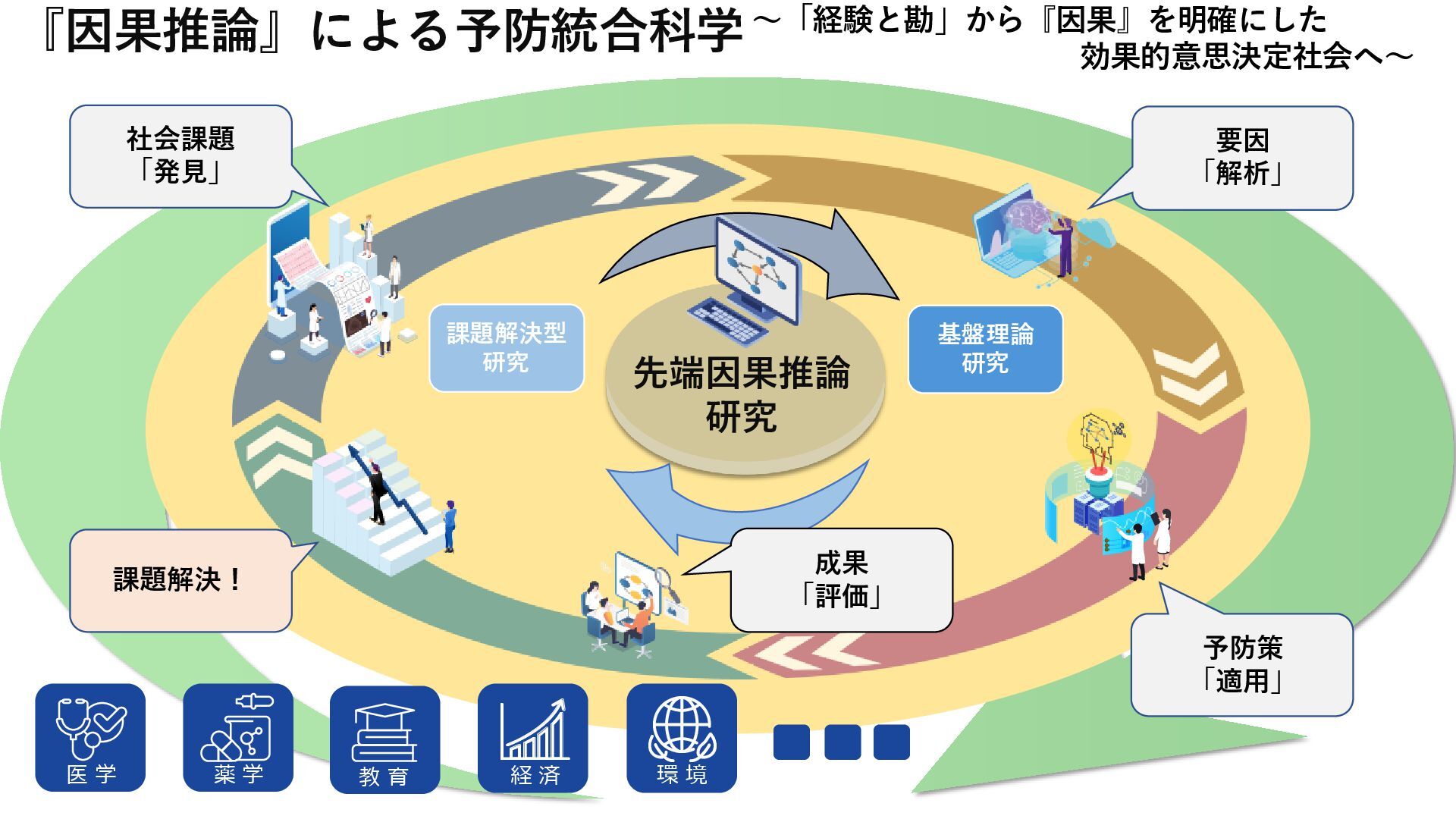 ~「経験と勘」から『因果』を明確にした 効果的意思決定社会へ~ 先端因果推論 研究 『因果推論』による予防統合科学 社会課題 「発見」 課題解決! 要因 「解析」 予防策 「適用」 基盤理論 研究 課題解決型 研究 成果 「評価」