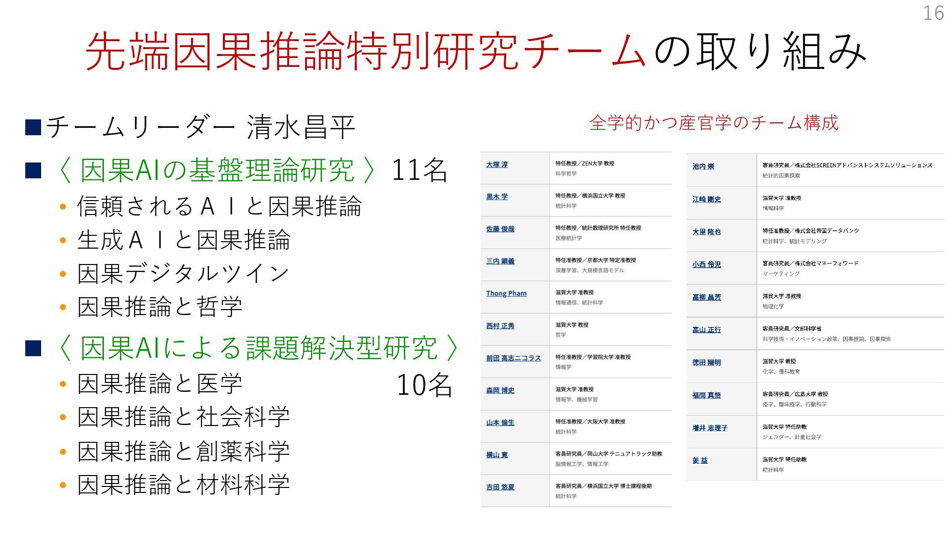 • 因果デジタルツイン • 因果推論と哲学 ◼〈 因果AIによる課題解決型研究 〉10名 • 因果推論と医学 • 因果推論と社会科学 • 因果推論と創薬科学 • 因果推論と材料科学 16 全学的かつ産官学のチーム構成 10名