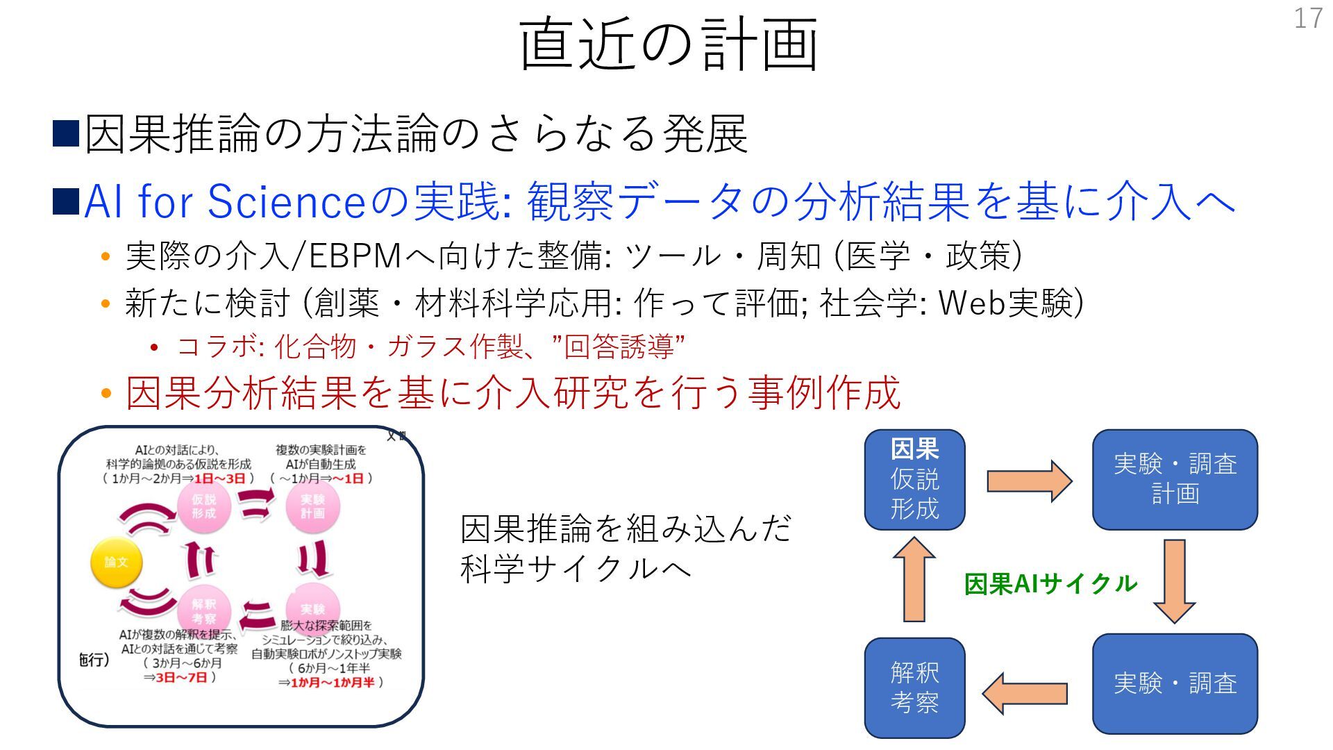 • 新たに検討 (創薬・材料科学応用: 作って評価; 社会学: Web実験) • コラボ: 化合物・ガラス作製、”回答誘導” • 因果分析結果を基に介入研究を行う事例作成 17 因果推論を組み込んだ 科学サイクルへ 因果 仮説 形成 実験・調査 計画 解釈 考察 実験・調査 因果AIサイクル