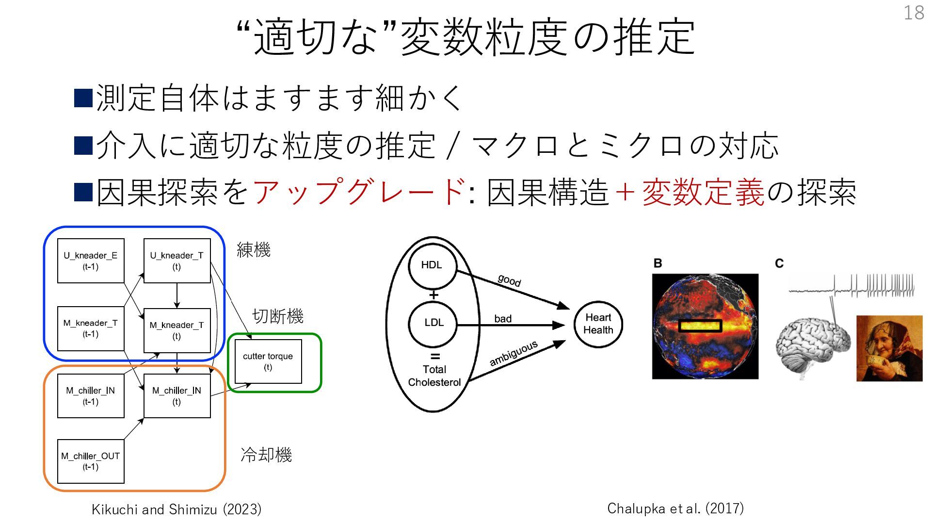 “適切な”変数粒度の推定 ◼測定自体はますます細かく ◼介入に適切な粒度の推定 / マクロとミクロの対応 ◼因果探索をアップグレード: 因果構造+変数定義の探索 Chalupka et al.
