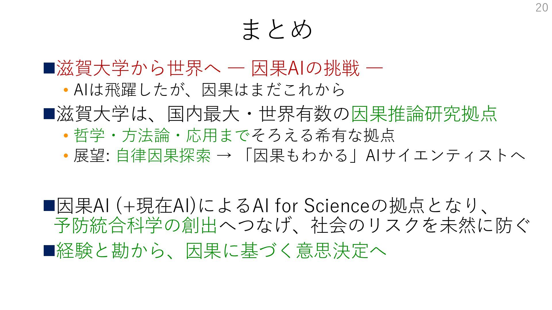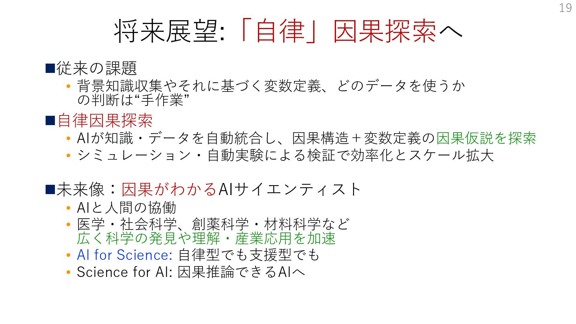 ◼未来像:因果がわかるAIサイエンティスト • AIと人間の協働 • 医学・社会科学、創薬科学・材料科学など 広く科学の発見や理解・産業応用を加速 • AI for Science: 自律型でも支援型でも • Science for AI: 因果推論できるAIへ 19