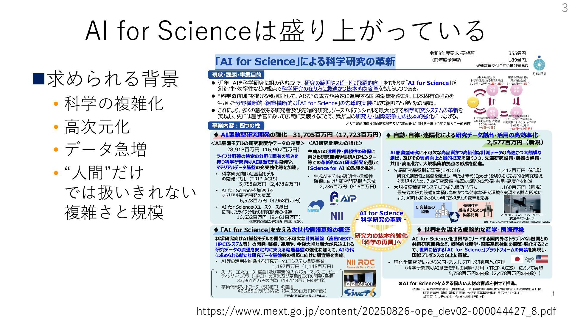 AI for Scienceは盛り上がっている ◼求められる背景 • 科学の複雑化 • 高次元化 • データ急増