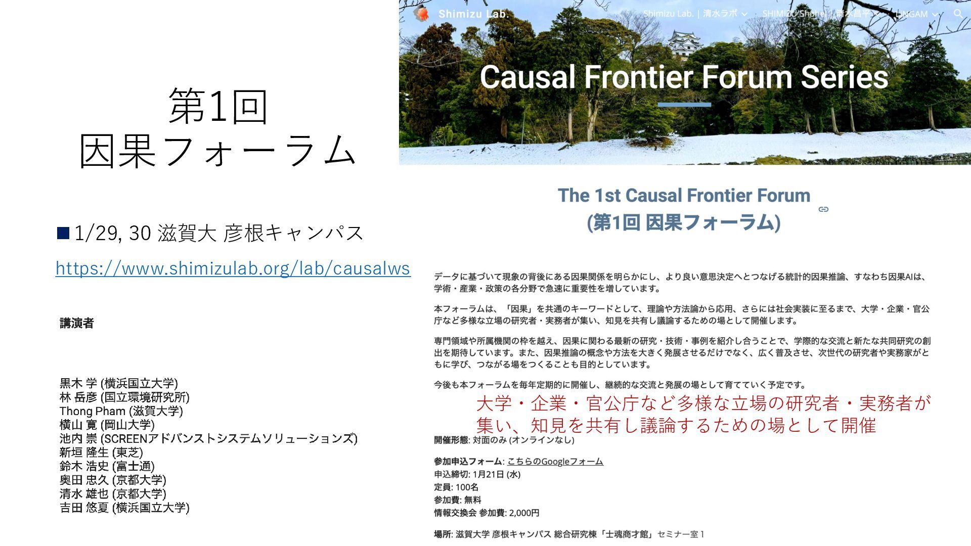 第1回 因果フォーラム ◼1/29, 30 滋賀大 彦根キャンパス 21 https://www.shimizulab.org/lab/causalws 大学・企業・官公庁など多様な立場の研究者・実務者が 集い、知見を共有し議論するための場として開催