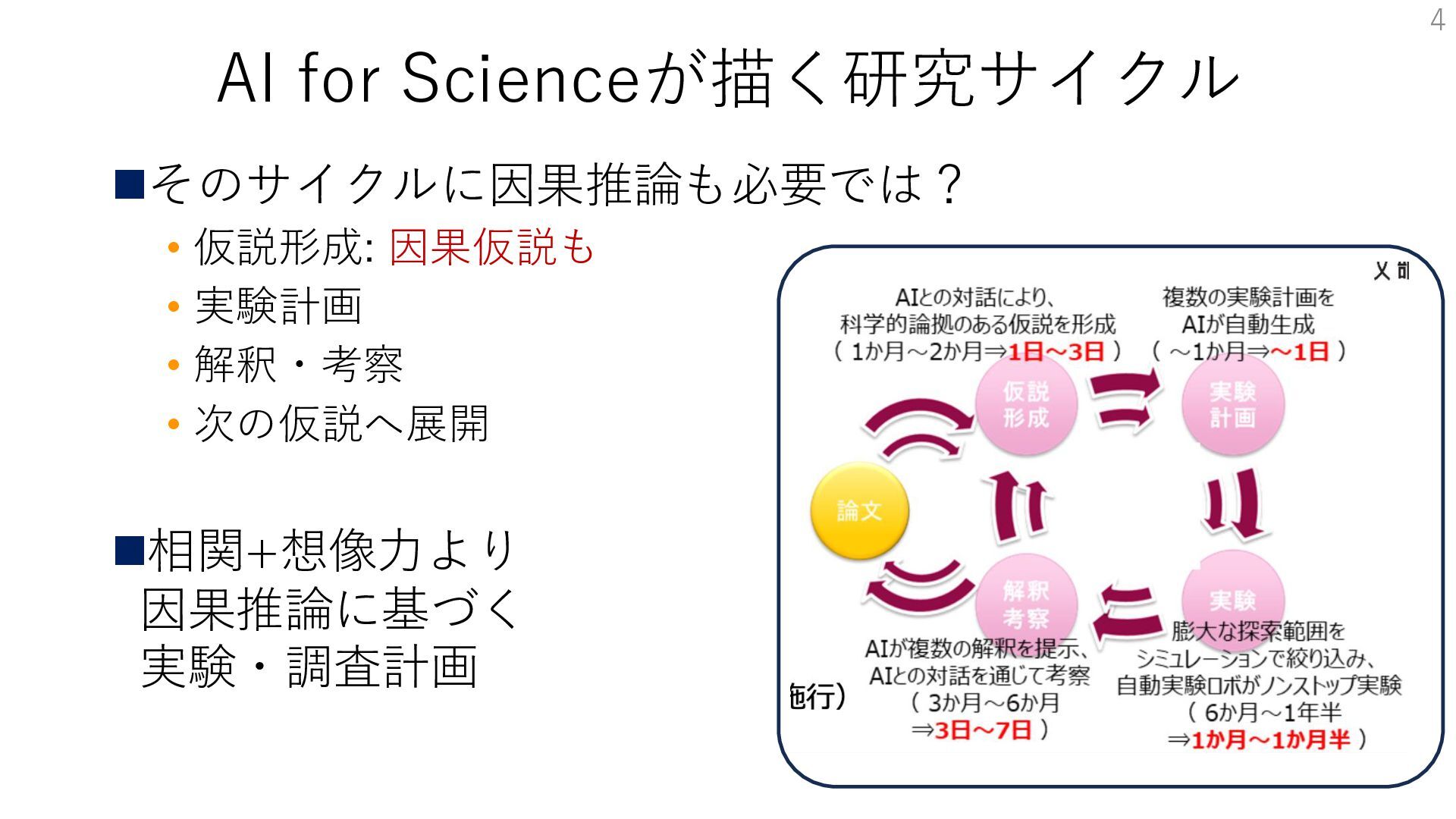 AI for Scienceが描く研究サイクル ◼そのサイクルに因果推論も必要では? • 仮説形成: 因果仮説も • 実験計画 •