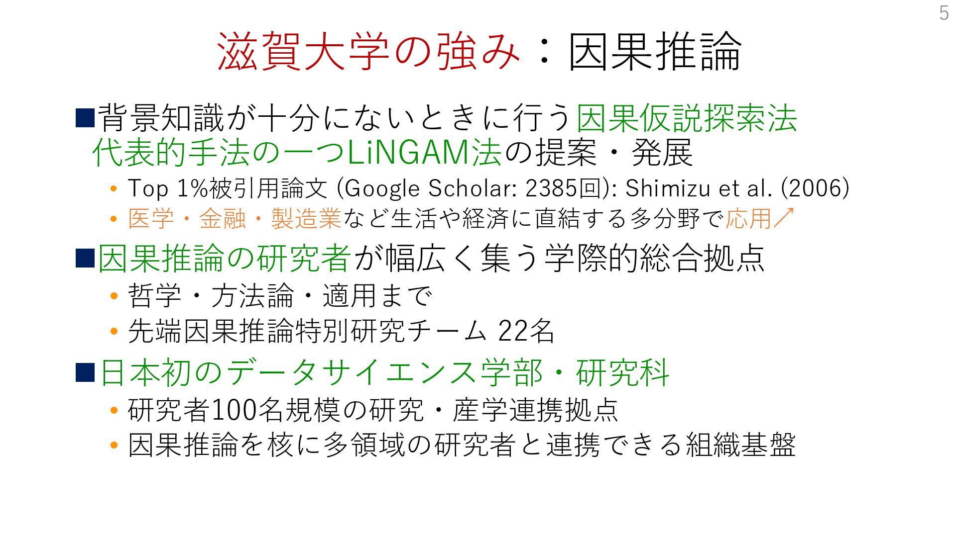 滋賀大学の強み:因果推論 ◼背景知識が十分にないときに行う因果仮説探索法 代表的手法の一つLiNGAM法の提案・発展 • Top 1%被引用論文 (Google Scholar: 2385回): Shimizu