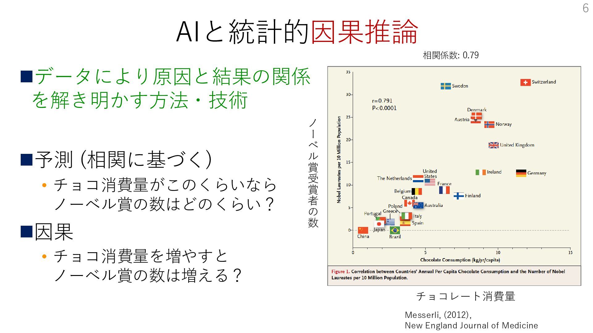 AIと統計的因果推論 ◼データにより原因と結果の関係 を解き明かす方法・技術 ◼予測 (相関に基づく) • チョコ消費量がこのくらいなら ノーベル賞の数はどのくらい? ◼因果 •