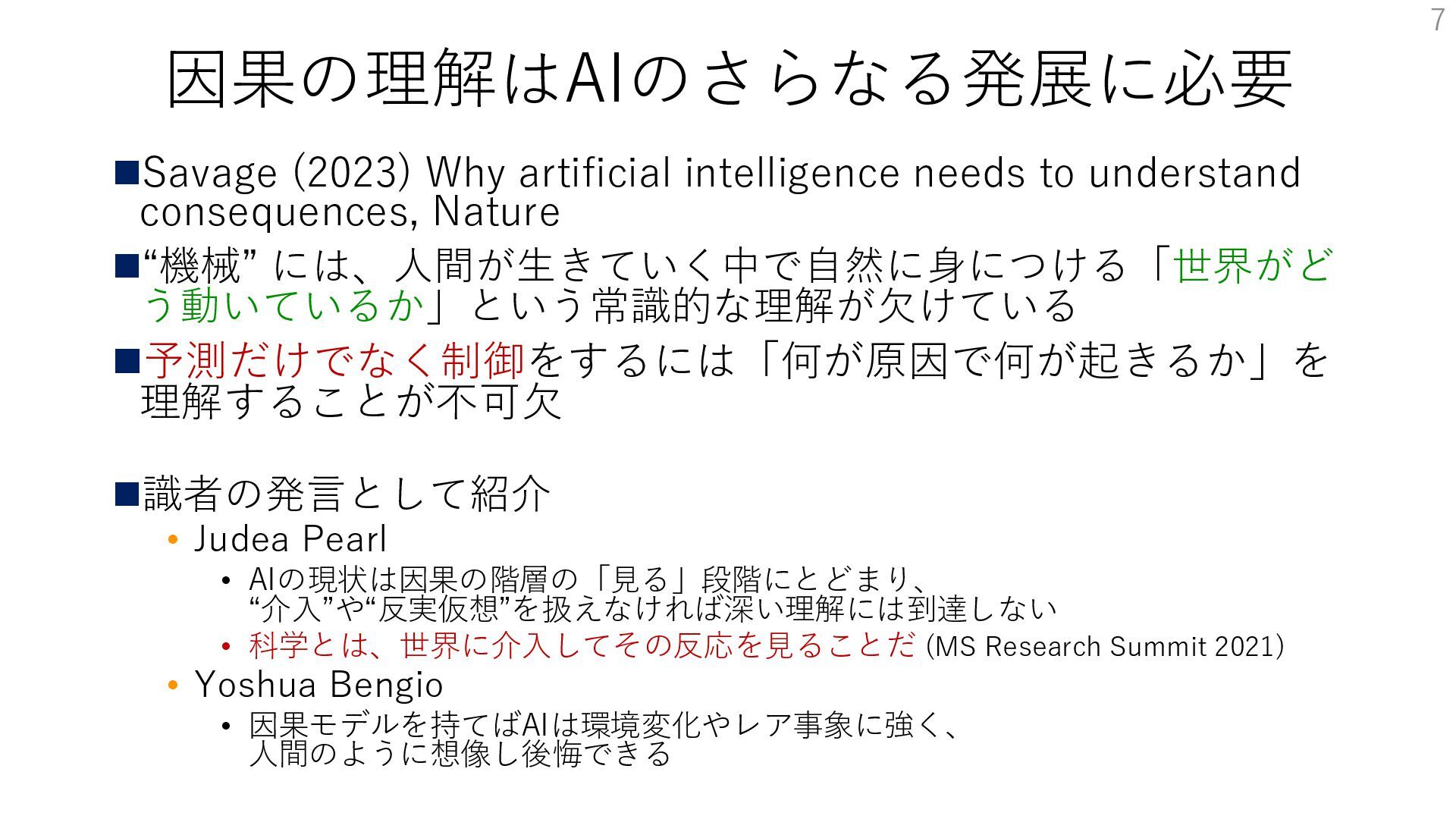 Nature ◼“機械” には、人間が生きていく中で自然に身につける「世界がど う動いているか」という常識的な理解が欠けている ◼予測だけでなく制御をするには「何が原因で何が起きるか」を 理解することが不可欠 ◼識者の発言として紹介 • Judea Pearl • AIの現状は因果の階層の「見る」段階にとどまり、 “介入”や“反実仮想”を扱えなければ深い理解には到達しない • 科学とは、世界に介入してその反応を見ることだ (MS Research Summit 2021) • Yoshua Bengio • 因果モデルを持てばAIは環境変化やレア事象に強く、 人間のように想像し後悔できる 7