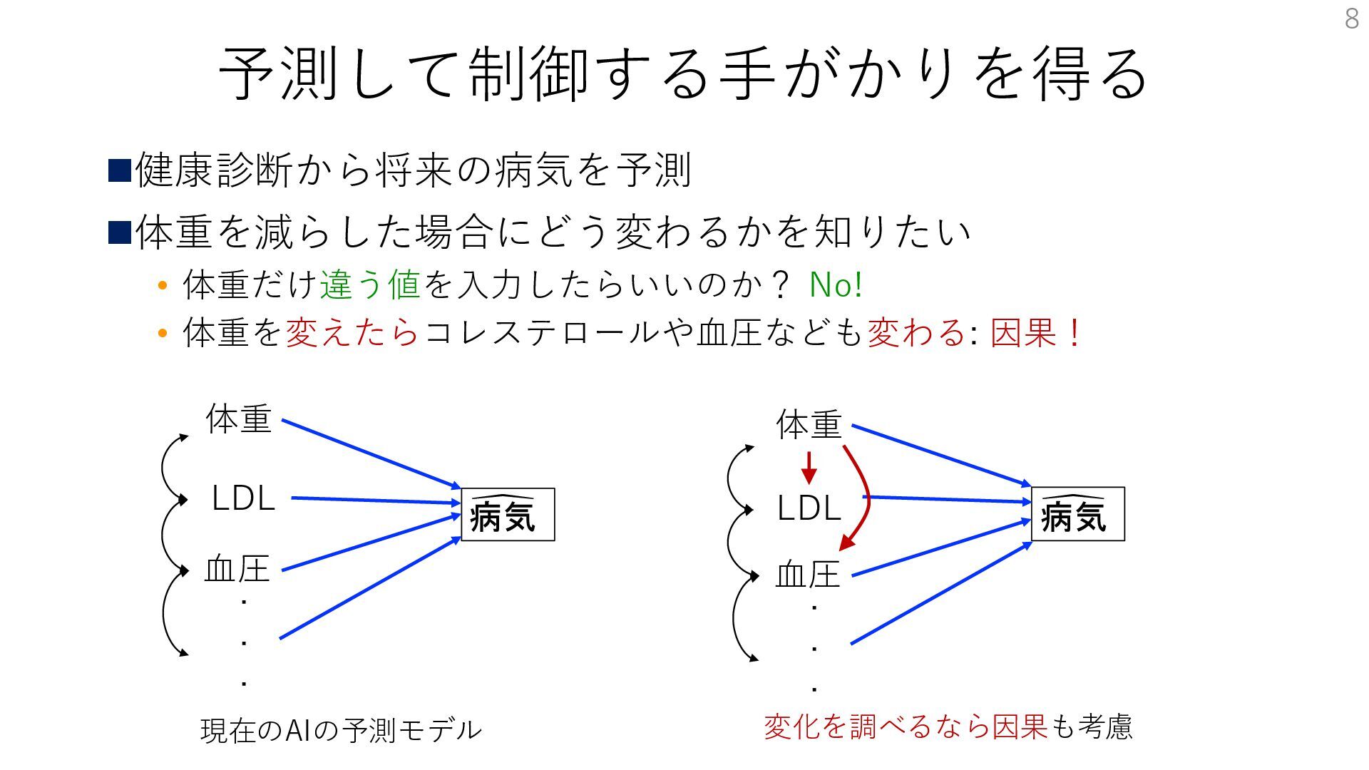 LDL 病気 血圧 . . . 現在のAIの予測モデル 体重 LDL 病気 血圧 . . . 体重 変化を調べるなら因果も考慮