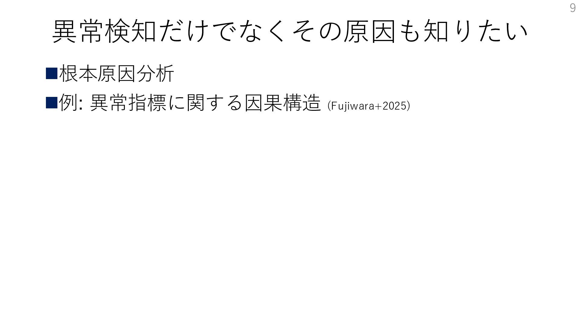異常検知だけでなくその原因も知りたい ◼根本原因分析 ◼例: 異常指標に関する因果構造 (Fujiwara+2025) 9