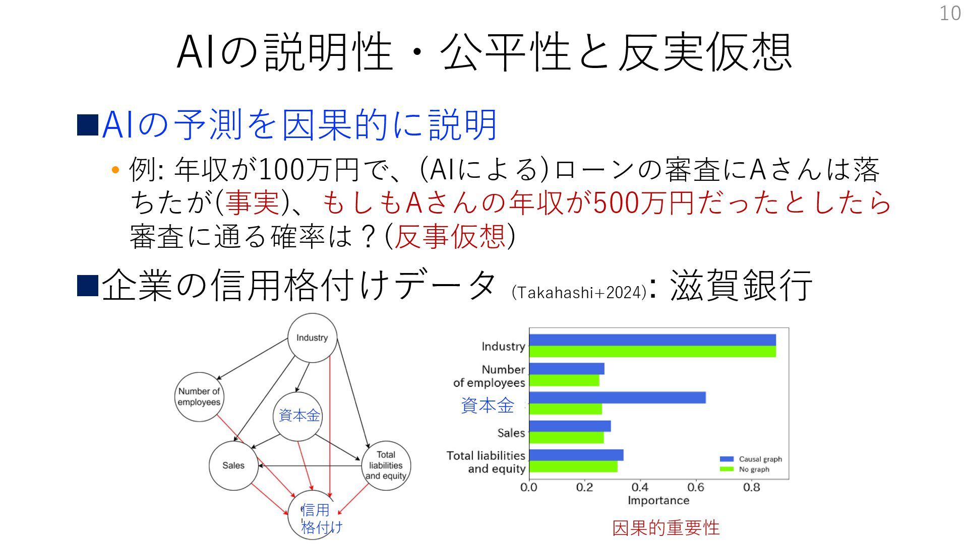 AIの説明性・公平性と反実仮想 ◼AIの予測を因果的に説明 • 例: 年収が100万円で、(AIによる)ローンの審査にAさんは落 ちたが(事実)、もしもAさんの年収が500万円だったとしたら 審査に通る確率は?(反事仮想) ◼企業の信用格付けデータ (Takahashi+2024) :