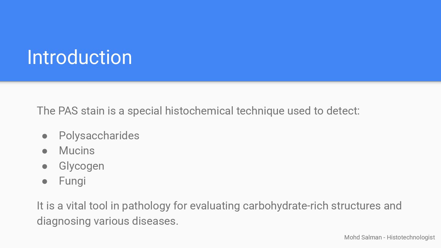 This presentation provides a step-by-step explanation of the Periodic Acid-Schiff (PAS) stain — a vital special stain used in diagnostic histopathology.