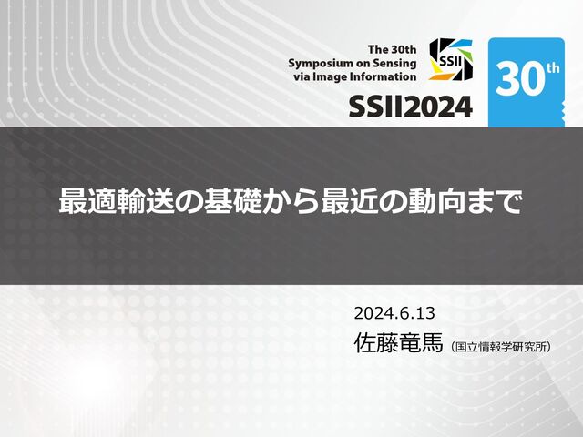 ライブラリを使えば簡単に最適輸送を求められる • 数値例: 二つの正規分布からの点群の比較 import numpy as np import matplotlib.pyplot as plt import ot # POT ライブラリ n = 100 # 点群サイズ mu = np.random.randn(n, 2) # 入力分布 1 (青) nu = np.random.randn(n, 2) + 1 # 入力分布 2 (オレンジ) a = np.ones(n) / n # 点重み (1/n, ..., 1/n) b = np.ones(n) / n # 点重み (1/n, ..., 1/n) C = np.linalg.norm(nu[np.newaxis] - mu[:, np.newaxis], axis=2) # コスト行列 P = ot.emd(a, b, C) # 最適輸送行列の計算(POT ライブラリを使用) plt.scatter(mu[:, 0], mu[:, 1]) # mu の散布図描写 plt.scatter(nu[:, 0], nu[:, 1]) # nu の散布図描写 for i in range(n): j = P[i].argmax() # i の対応相手: 最もたくさん輸送している先 plt.plot([mu[i, 0], nu[j, 0]], [mu[i, 1], nu[j, 1]], c='grey', zorder=-1)