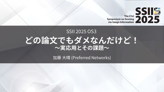 概要: 近年、⾞載センサ⼊⼒から経路計画を直接予測する End-to-End の⾃動運転技術が盛んに研究されており、産業界でも従来のモジュー ルベース⼿法に代わり採⽤が進んでいます。しかし、 End-to-End モデルを作ってから実際の⾞両で動かすまでには多くの課題が存在しま す。本講演では、チューリングにおける開発事例をもとに、このギャップとその解決策について議論します。 下⽥ 和 ⽒ (株式会社サイバーエージェント) 『広告における画像⽣成技術の実応⽤の現状』 概要: 昨今、画像⽣成技術は拡散モデルの台頭やFlow matchingベースのモデルの登場などにより、広く注⽬を集めています。⼀⽅で、画像 ⽣成技術を実際のビジネスに活⽤している話を⽿にする機会は⽐較的少ないのではないかと思います。サイバーエージェントにおける事例 から、画像⽣成技術の実応⽤においてどのような課題があるのか、画像⽣成技術がどういった形で活⽤されているのかについて議論しま す。 森 裕紀 ⽒ (早稲⽥⼤学 / 株式会社トクイテン) 『有機ミニトマト農場におけるロボット開発と基礎研究』 概要: 講演者は農業の持続可能性を⾼めるため有機農業を⾃動化するスタートアップを共同創業して、農業⾃動化のためのロボット開発を進め ている。 本講演では、認知ロボティクスなどの基礎研究を⾏ってきたロボット研究者がスタートアップでどのようにロボット開発を⾏ってき たか報告する。
