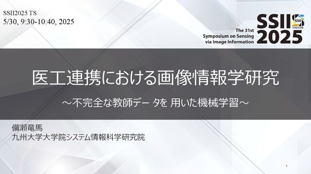 (佐藤洋一教授) カーネギー メロン大学留学 (金出武雄教授) 2002.4 2010 2017.4 2015 2013 国立情報学 研究所 特任准教授 (佐藤いまり研) 九大シス情 内田研 准教授 アカデミアへ 13年 1.5年 現在 細胞画像解析(検出・セグメンテーション・トラッキング) 光超音波画像@ImPACT, AMED 病理画像 内視鏡画像 Optimization, Supervised Learning Efficient Labeled Learning TMI×2,MedIA×2 MICCAI2019×2, 2020 MICCAI 2021×3, MICCAI2023 CVPR2020, ECCV2020 MICCAI2016, MICCAI2017×2, MICCAI2020, 2022 BMVC2024 MedIA2021, 2024 MICCAI2019,2021, 2024 CVPR2019, 2025 ECCV2020 ICASSP2023, 2024 ICCV2023, ECAI2024 主要論文 2023.12 九大シス情 教授 ここ数年の半分以上が 不完全な教師からの学習手法 自己紹介: 備瀬竜馬 九州大学大学院システム情報科学研究院 ア カ デ ミ ア 研 究 ト ピ ッ ク MVA2025 General Chair CVPR2024 Area Chair MICCAI2024 Area Chair