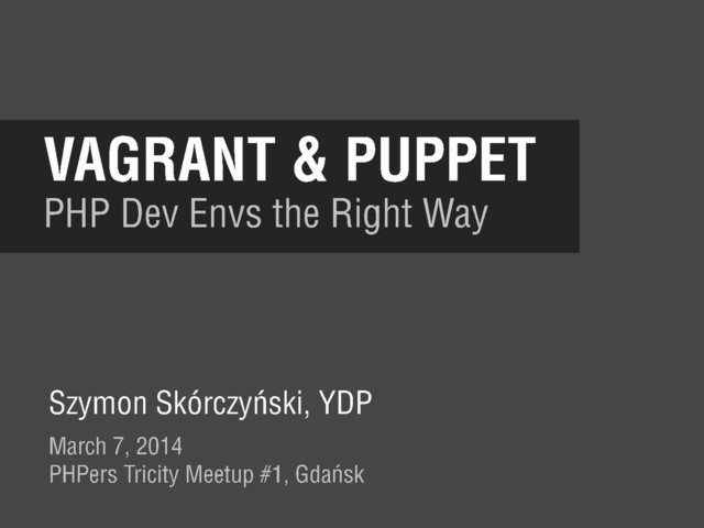 Vagrant lets us create lightweight and portable dev envs, while Puppet makes configuring them easy. The presentation is about how this great tandem can make PHP developers life easier.