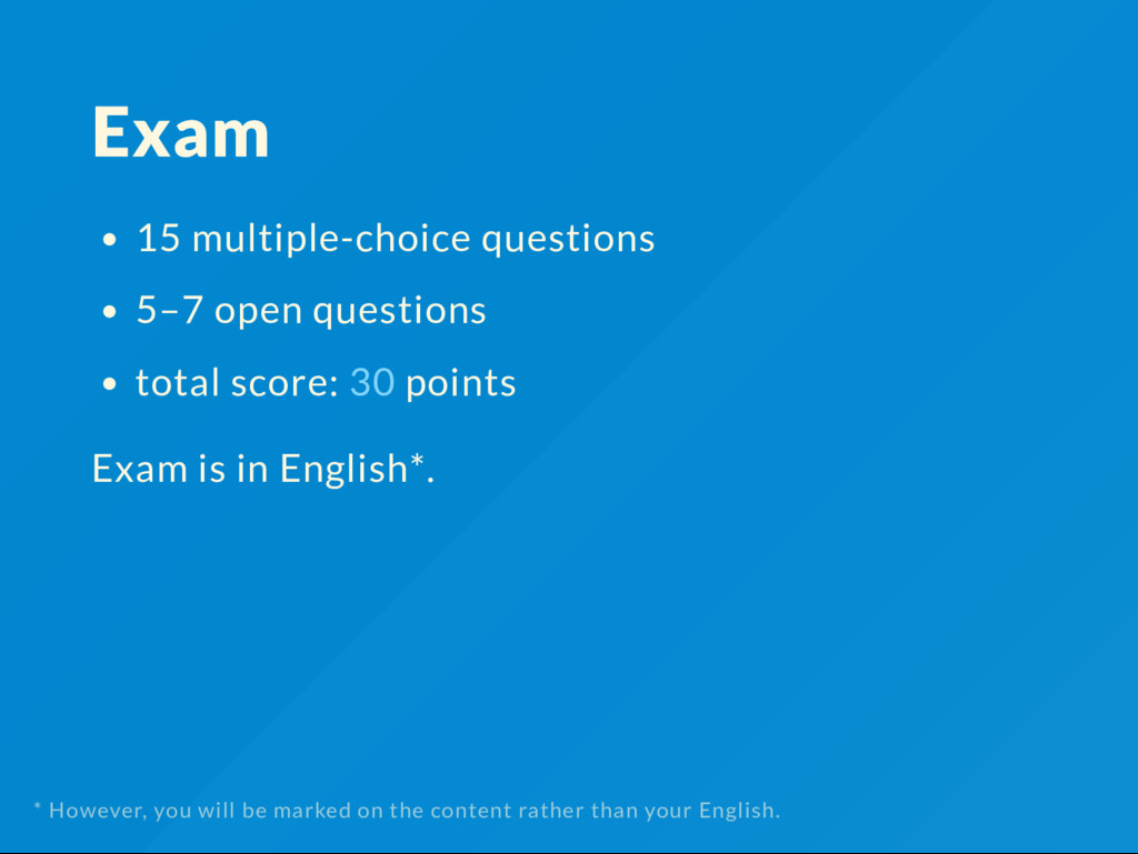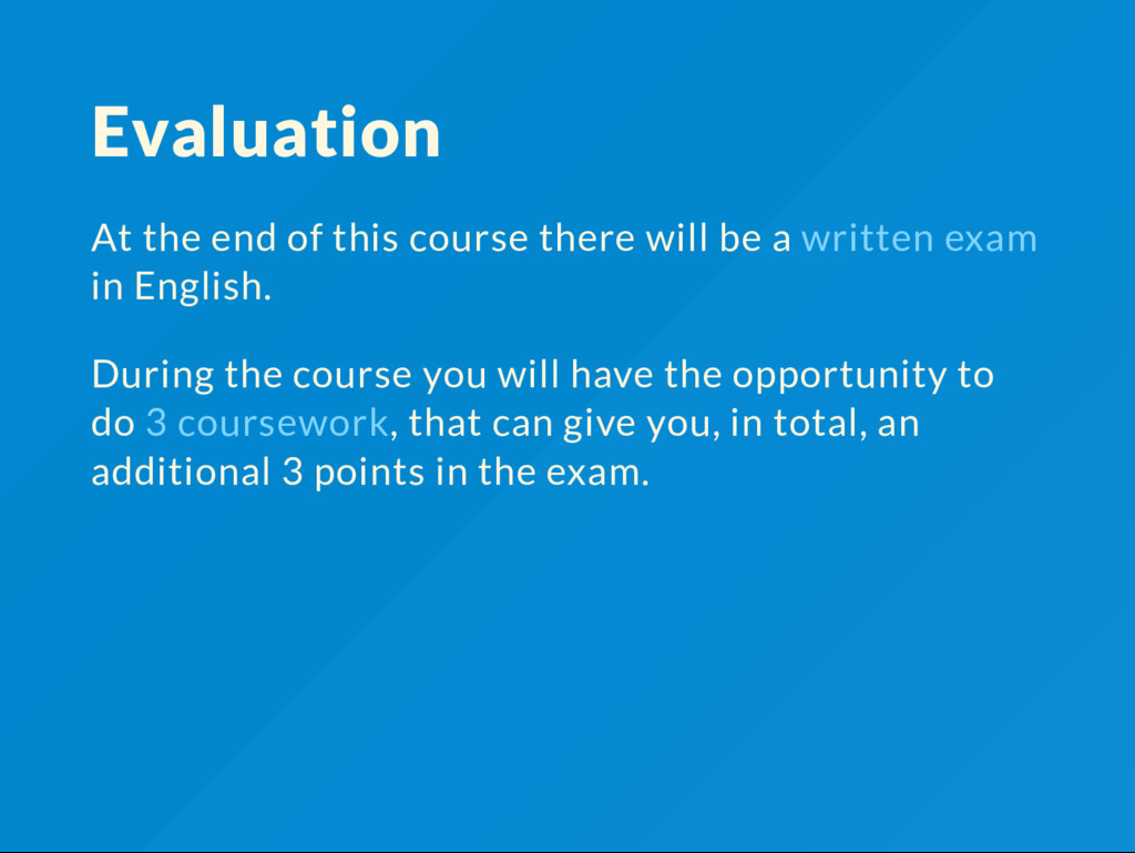 a written exam in English. During the course you will have the opportunity to do 3 coursework, that can give you, in total, an additional 3 points in the exam.